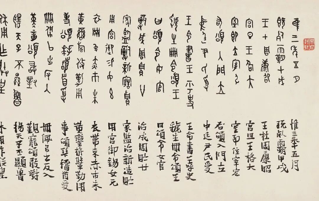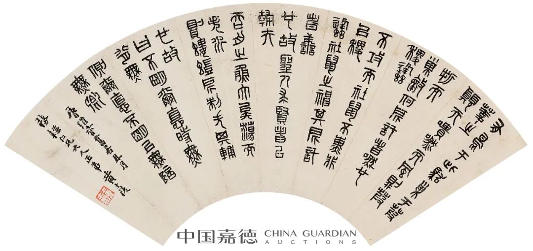 是年六月黄士陵为欧阳務耘篆书扇面节录《韩诗外传》卷八,书风似秦诏版、亦似汉祀三公山碑意,这种缪篆字体方整大气,与黄士陵印章用字几乎相同,且书于扇面时用笔平直间掺以孤线其中,古朴而顿见灵动活泼的书意。