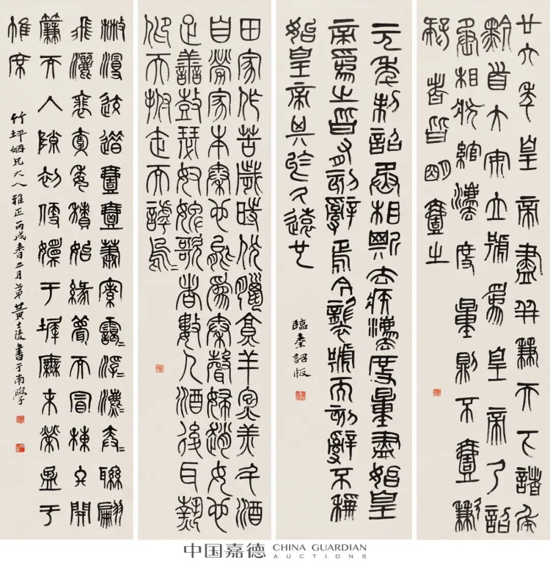 各体篆书四屏是丙戌春二月黄士陵38岁时所作,其时尚在北京国子监研习金石学。四屏分别临秦廿六年诏版、秦元年诏版、书汉杨恽《报孙会宗书》选、书南北朝谢惠连《雪赋》选,四屏中临廿六年秦诏版疏朗潇散,临秦元年诏版则古拙苍劲。《报孙会宗书》、《雪赋》篆书风格各异,一为吴让之书意,另一则取法先秦大篆。四屏书法反映出早年黄士陵学习经典及皖派前贤的雪泥鸿爪。