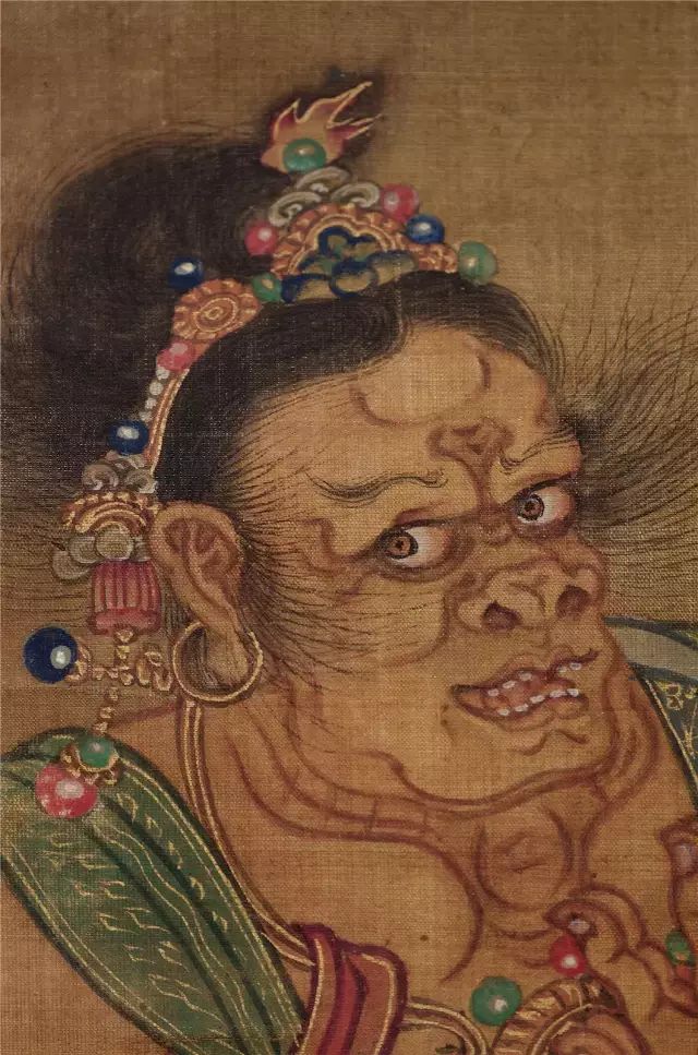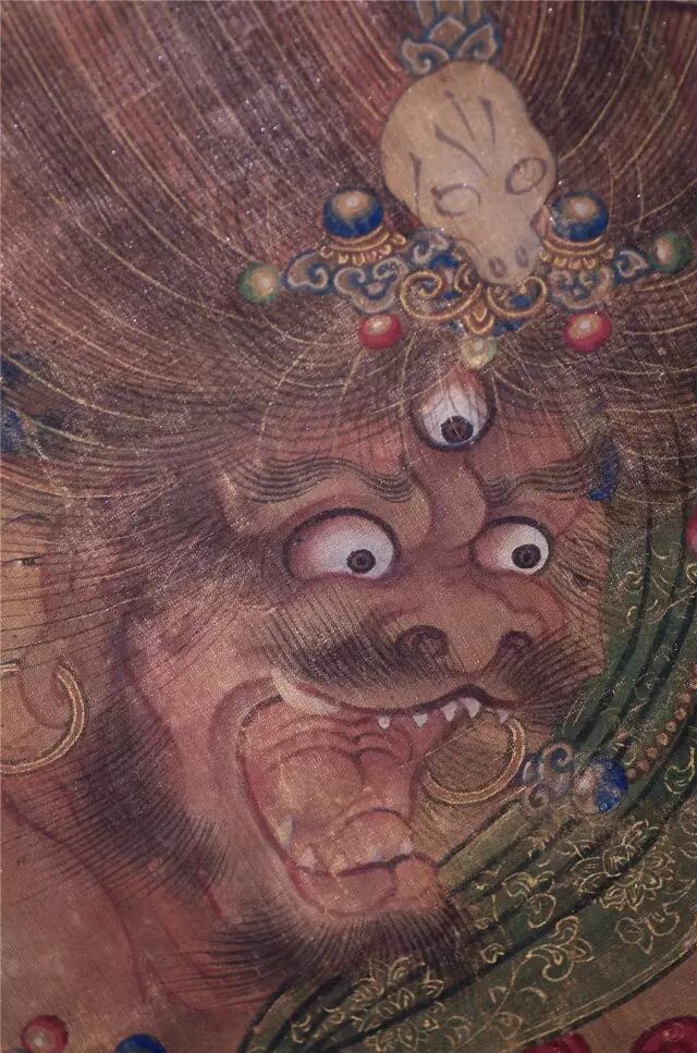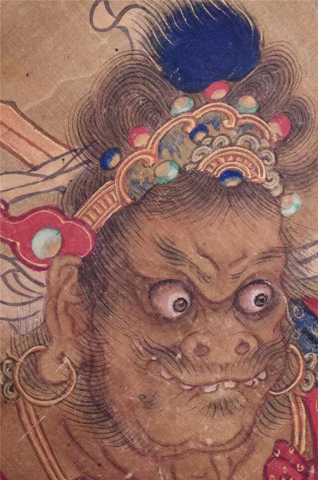 此画上端绘一趺坐菩萨。下绘大力明王竖发怒目张口,现三头六臂相,坐于妖魔鬼怪之上。明王四肢肌肉坚强,孔武有力。