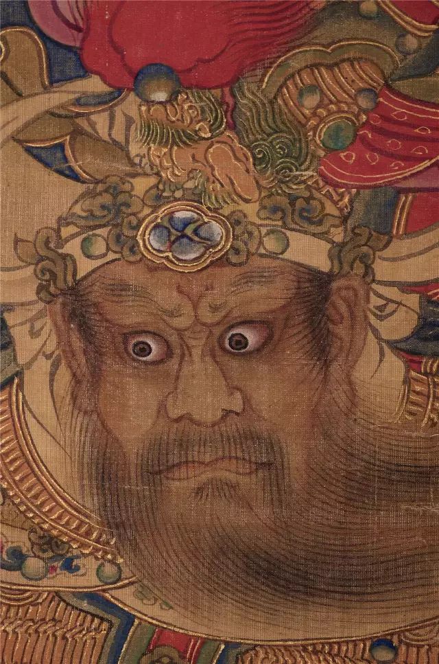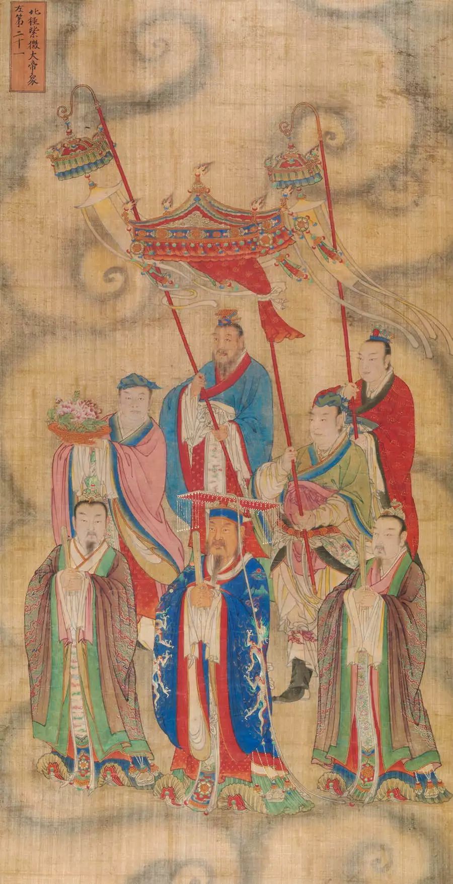 三位至尊神,分别是:玉清元始天尊、上清灵宝天尊、太清道德天尊。这三请又有四位辅佐的天神,分别是:玉皇大帝、北极紫微大帝、天皇天帝和后土黄地。四御之首为玉皇大帝,其次是北极紫微大帝。北极紫微大帝位居天的中央,协助玉皇大帝执掌天地经纬,日月星辰及四时节气等自然现象,在中国古代民间极受崇拜。那么佛教在汉化的过程中,自然不可忽视这样一位执掌自然界的天神,所以在水陆画中,将他请进上堂,可见佛教在流传的过程中灵活变通。画中的紫微大帝,身穿人间皇帝冕服,两旁左辅右弼随侍,是人间君臣之像的写照。