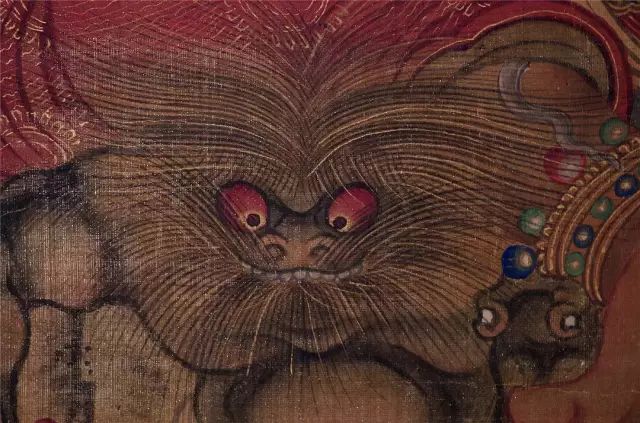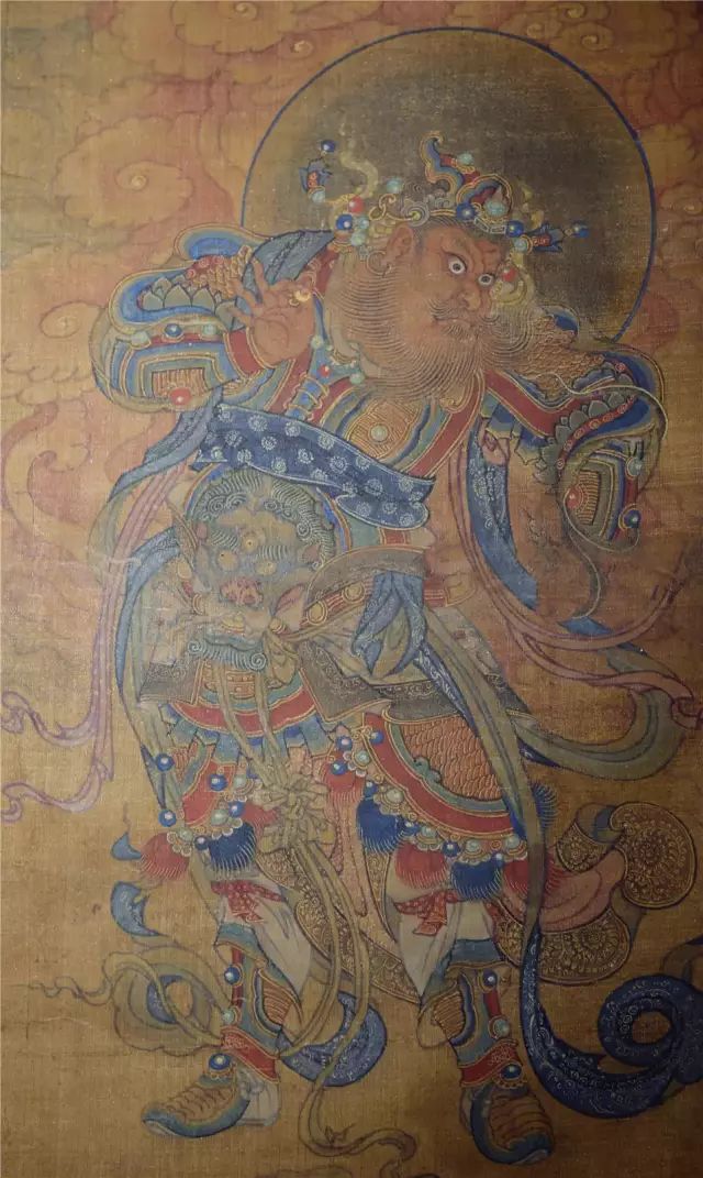 南方宝生佛的化身。“军咤”意译为“瓶”,瓶在密宗里是甘露的象征,意为以慈悲为怀,遍洒甘露水,以洗涤众生的污秽心灵。此画上端绘一趺坐菩萨,四周围绕行云和飘带。明王怒发冲天,现三头八臂相,箕踞于麒麟身上。