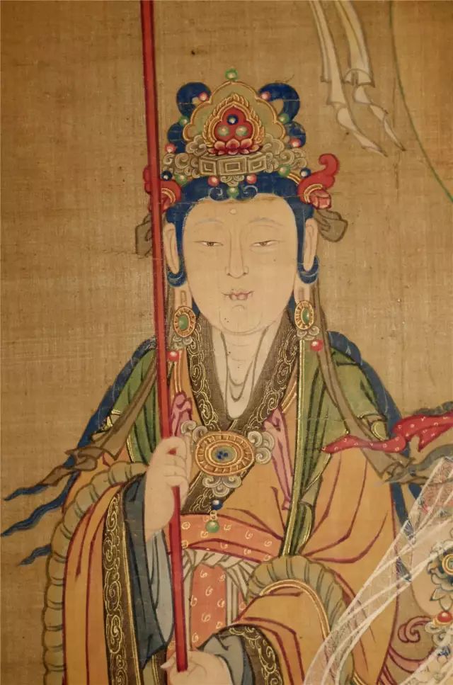 水陆画《九天后土圣母诸神众》中的九天是道教三十六重天中的第九重天,后土圣母的居住地。画中十位女神像,名为神众,实则为人间贵妇的写照。她们面庞丰腴,细眉小口、双手持笏、注视前方,既雍容华贵,又威严庄重。