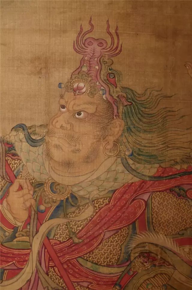 四龙王着袍服执笏而立,身后夜叉海妖随侍。佛教中原有“七龙王”、“八大龙王”的典故,后与中国本土的海神崇拜和道教信仰相结合,遂成四海龙王。