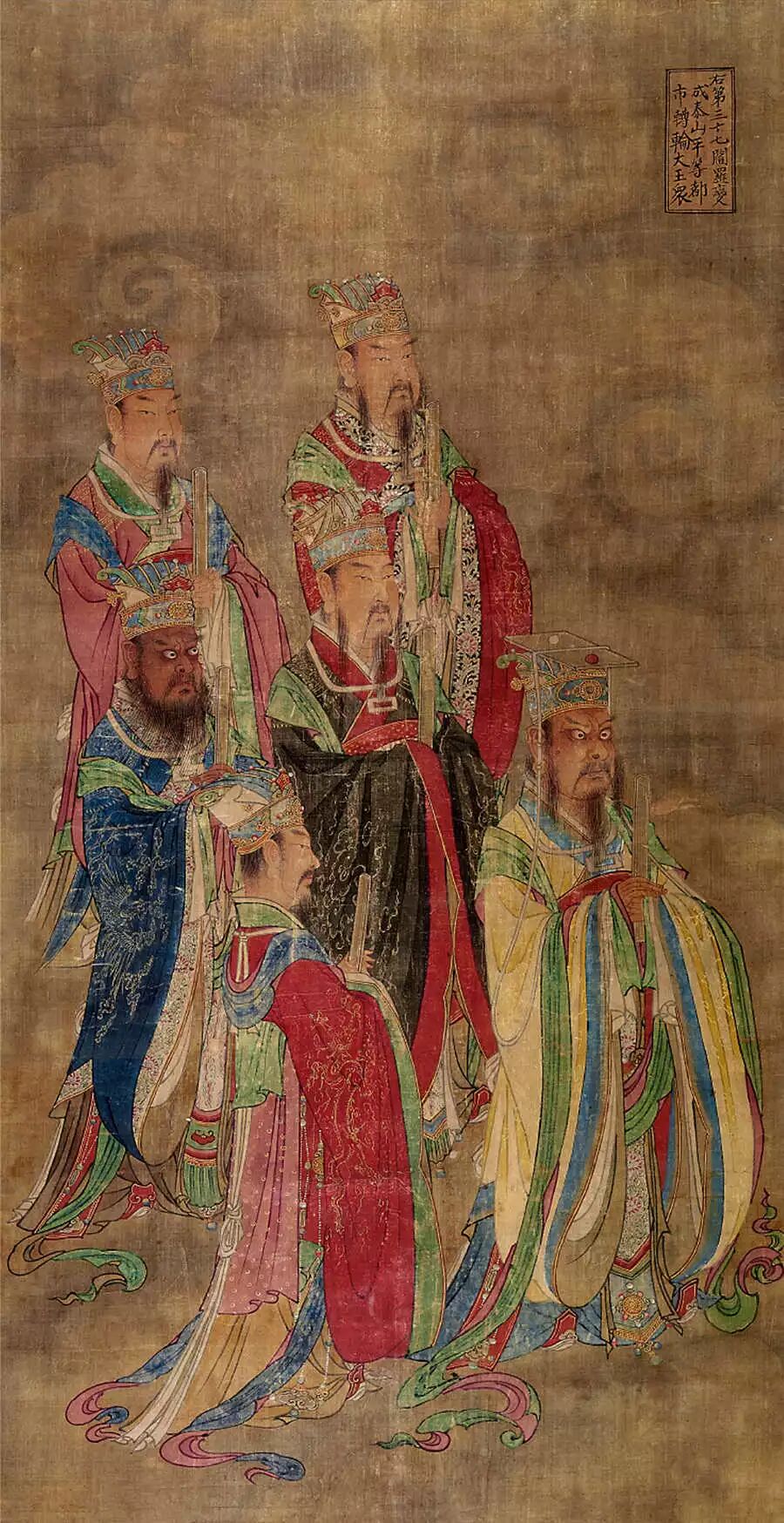 阎罗、变成、泰山、平等、都市、转轮为十殿阎罗中的第五至第十殿阎罗,是古印度神话就已经出现的掌管地府的诸王。画面上人物皆持笏板,着朝服,戴方心曲领。