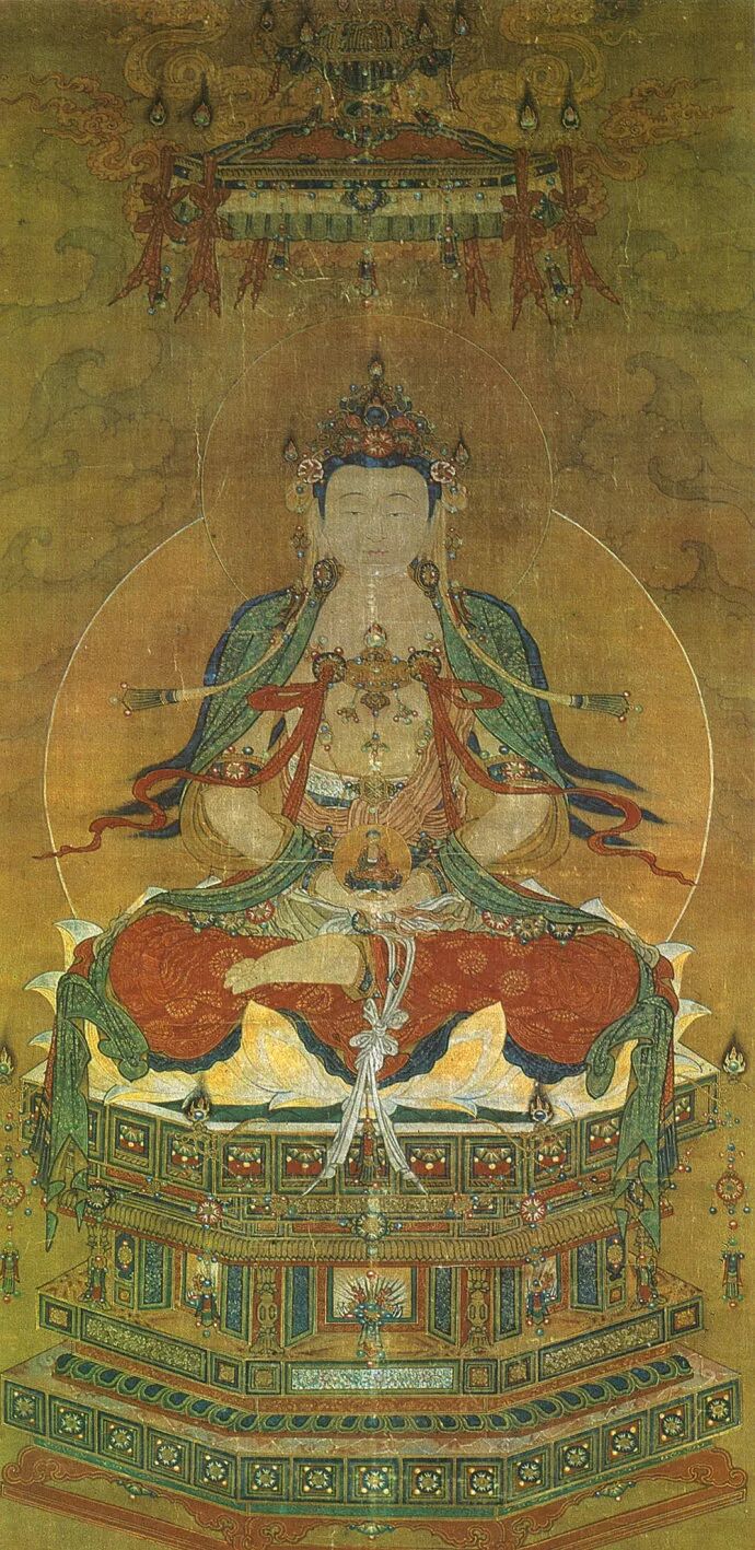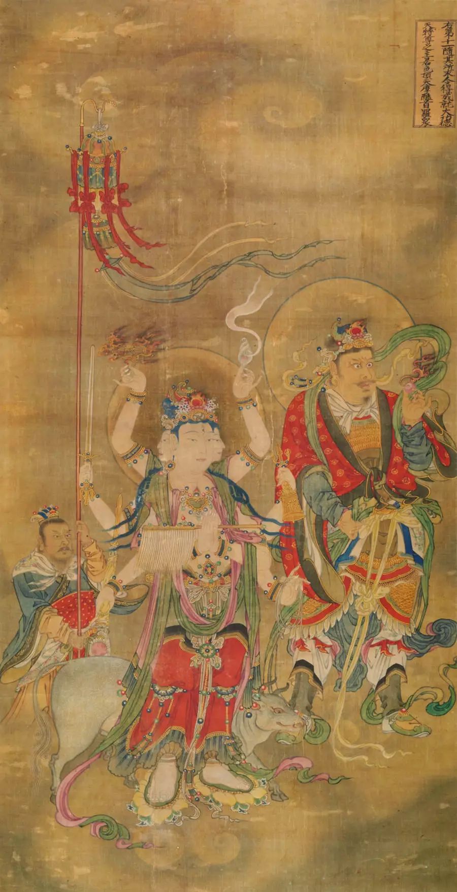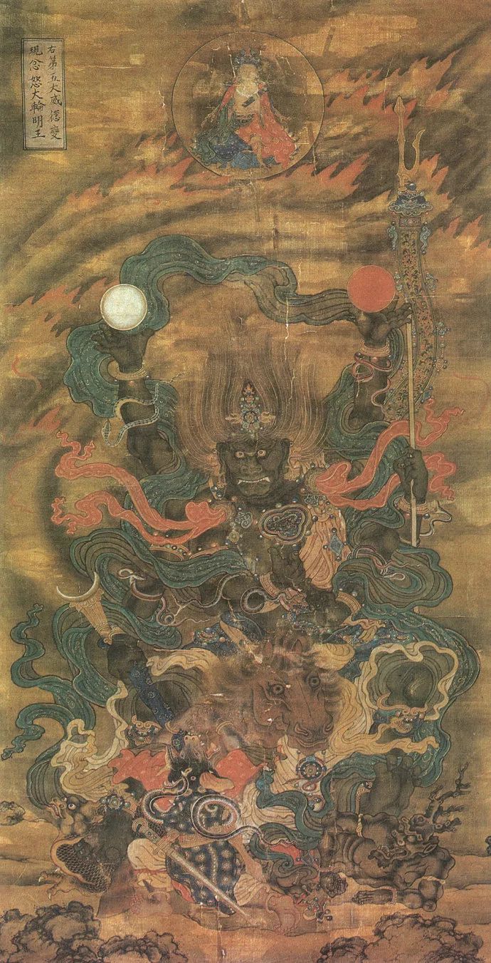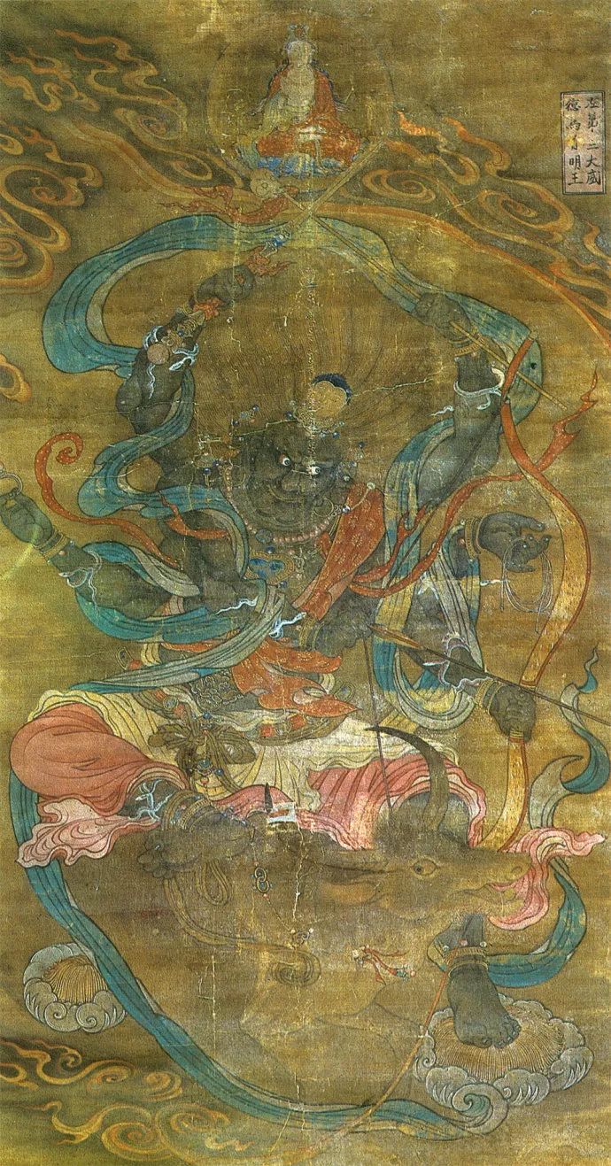 弥勒菩萨之化身,能排除众生的一切业障。此画上端绘一趺坐菩萨。明王青目獠牙,竖发怒目,现三头六臂相,上身赤裸,飘带缭绕。上右手举月,上左手举日,骑一大马,座下左右两龙伏卧,中有一怪物举首仰望。