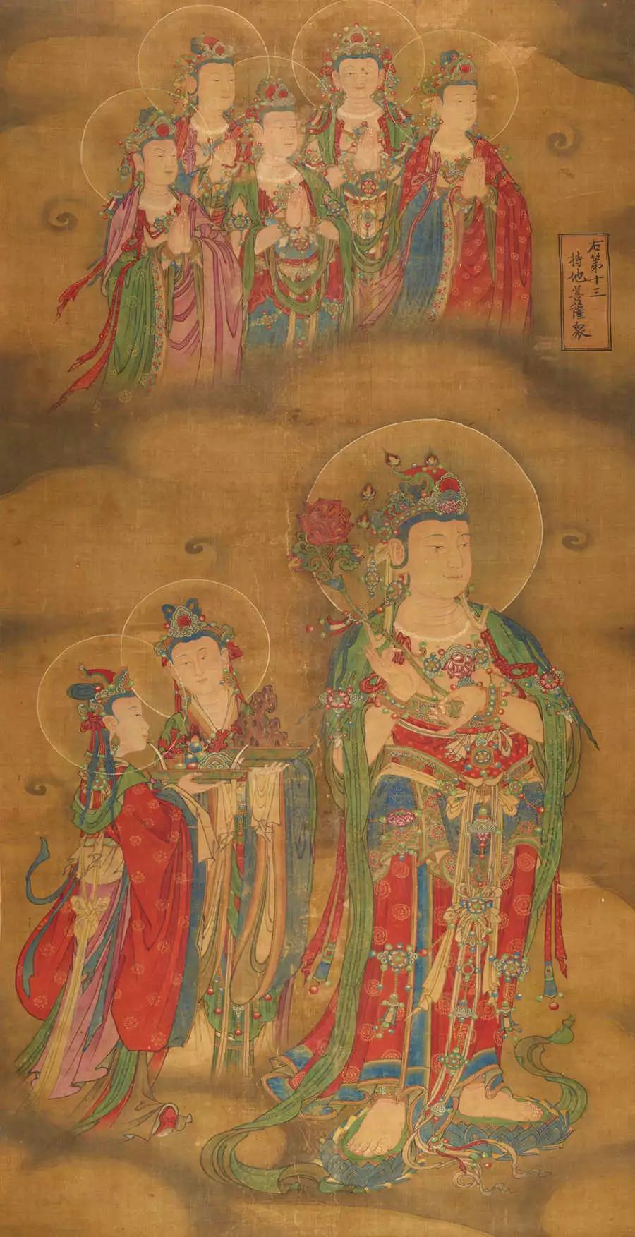 该画分两层,下层为持地菩萨主像,身后侍女手中所捧盆景山石,意在表现主题“持地”。上层画五位菩萨,合十而立。