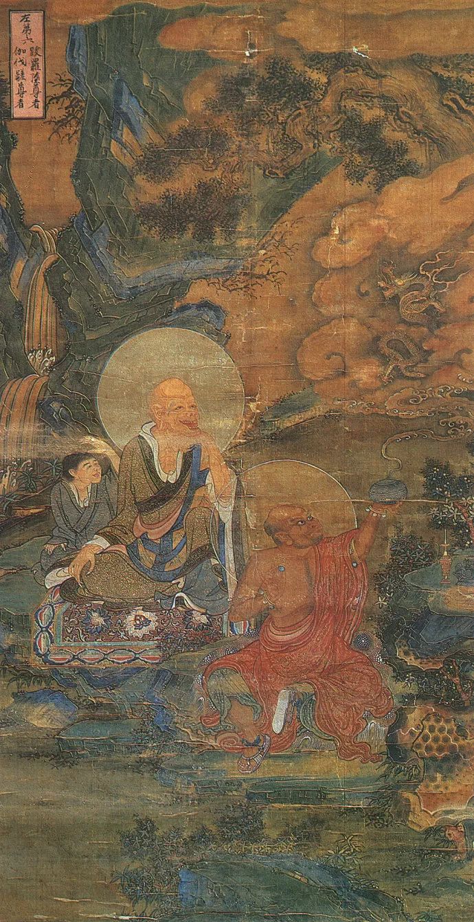 此画中,跋罗堕尊者手托钵盂,钵内烟雾中腾现一龙。年纪较长的伽伐磋尊者坐于石上,旁立小童。背景山水,树石杂置,动静相合,别有意趣。