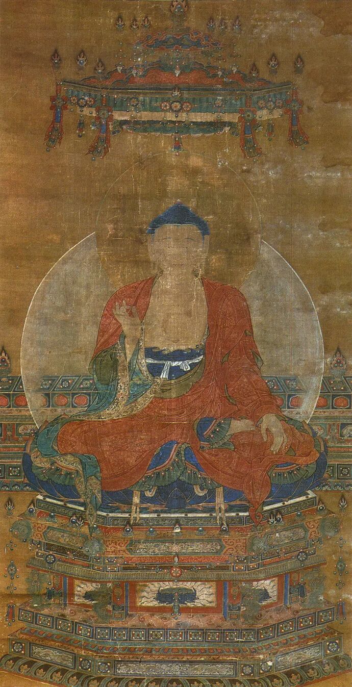 毗卢遮那佛(即大日如来),佛以法为身,故称法身,法身处于常寂光净土,象征佛法无处不在。意译为“光明普照”、“遍一切处”、“大日”。在密宗法系中是最高身位如来,故密教称毗卢遮那佛为“大日如来佛”,为密教教主。密教五方佛中正中央佛。佛像结跏趺坐于莲花须弥座上,身着红色袈裟,双手结毗卢印于胸前。
