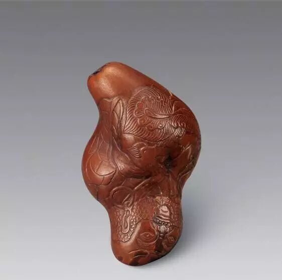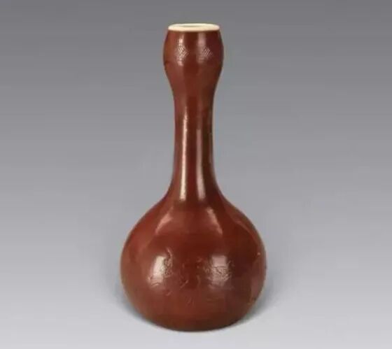 以蒜口瓶为范制成葫芦瓶,范多瓣。瓶口点缀一圈斜纹装饰,蒜头形,长颈,圆肚,正大。肚上暗刻有花鸟图案,多种果树、残叶、山石等物布饰周遭,其间画眉鸟立于枝头,螳螂穴于石间,蝴蝶飞扑左右,一幅生动的”秋趣图”俨然可见。该葫芦瓶色泽甚美,呈紫红色。匏器历来以紫红者为极品,亦即《燕京岁时记》所谓”以紫润坚厚者为上”,其年代早则为嘉、万,晚亦为康、干,久经磨挲,人气润泽,及得肤如处子而色如重枣。紫红皮葫芦,暗刻花鸟,尤为珍品。