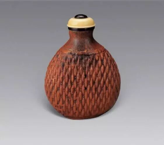 笸箩纹为葫芦器常见图案,宫廷、民间皆有之,其造型及图案细部实摹拟汲水之柳罐。范四瓣,形如鱼篓,扁平,取其扁薄,易于入怀。壶盖为象牙口,象牙嵌玳瑁蒙心。把玩时日已有,鼻烟壶色已暗红。