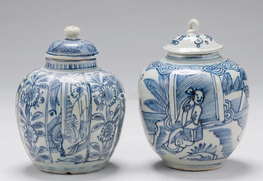 日本関西2017年秋季拍卖会明晚期青花铁线描人物盖罐一对