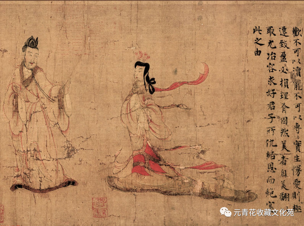 唐代著名画家顾恺之创作的《女史箴图》,笔法如春蚕吐丝,形神兼备。他所采用的铁线描手法,使得画面典雅、宁静又不失明丽、活泼。画面中的线条循环婉转,均匀优美,人物衣带飘洒,形象生动。女史们下摆宽大的衣裙修长飘逸,每款都配以形态各异、颜色艳丽的飘带,显现出飘飘欲仙、雍容华贵的气派。