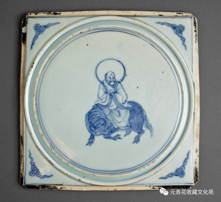 Ming Wanli blue and white Laozi riding a bull figure square tile museum number frank 814 description with underglaze blue decoration square tile. The structure of the square tile is similar to that of BM 1947.0712.194, with opaque stepped edges with cut corners. It has a raised double-ridged ring in which the philosopher Lao Tzu, shown in underglaze blue, rides a buffalo, with "ruyi" swirls of clouds at each corner. Otherwise, there is no glaze. Culture/period Ming Dynasty Wan Li (approximately) Date of production 1573-1620 (approximately) Dimensions Length: 20cm Width: 20cm. Lao Tzu (604-531 BC), a famous founder of Taoism, is traditionally believed to have been born in Hu County, near Luyi City, Anhui Province. According to legend, he was born with white hair and was eighty-one years old, so his name was translated into English as "old son". He is believed to have conveyed 5, 000 words "on the way" to frontier officers in the sixth century BC. He taught that people should not strive to achieve, but should do nothing, because everything will turn out all right in the end, and it is often better to let it go. This Taoist sagacity was highly esteemed in the late sixteenth century. A hanging paper scroll in the National Palace Museum in Taipei, painted in ink and light colors on paper, shown by the famous master of the philosophy school Zhang Lu (c.1490-c.1563), has a similar image of Lao Tzu riding a bull. Donor: Sir Augustus Wollaston Franks.(明万历 青花老子骑牛图方瓷砖 博物馆编号 坦率的814 描述 带有釉下蓝色装饰的方形瓷砖。该正方形瓷砖的结构与BM 1947.0712.194类似,具有不透明的阶梯状边缘,带有切角。它有一个凸起的双脊环, 其中的哲学家老子以釉下蓝色显示,骑着水牛,每个角落都有“如意”云卷。反之则无釉。文化/时期 明代 万里 (大概)生产日期 1573-1620 (大约)外型尺寸 长度:20厘米 宽度:20厘米.老子(公元前604-531年),道教的著名创始人,传统上被认为出生于安徽省鹿邑市附近的胡县。根据传说,他出生时白发,已 经八十一岁,因此他的名字被翻译成英语“老儿子”。据信他传达了五千字 公元前六世纪向边防官员“道途经”。他教导人们不要为取得成就 而奋斗,而应该无所事事,因为万事万物最终都会好起来的,而且往往更好地任其发展。道家的这种睿智在十六世纪后期备受推崇。台北国立故 宫博物院的一幅悬挂着的纸卷,用墨水和浅色在纸上作画,由哲学派的著名大师张露(c.1490-c.1563)显示,类似的图像是老子骑牛。.捐赠者 :奥古斯都·沃拉斯顿·弗兰克斯爵士)