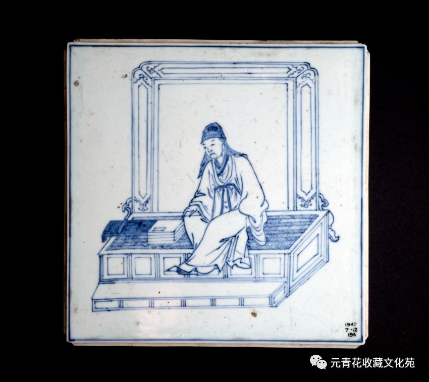 Ming Wanli Blue and White Characters Square Tile Museum No. 1947,0712.194 Describes square tiles with underglaze blue decoration. This square tile has opaque glazed step edges with cut corners. It is painted with an underglaze blue outline on the upper surface of the underglaze, showing the scholar inspecting the floor. He wore a loose, crossed robe tied to the front and tied to the scholar's cap. He was sitting cross-legged on a rattan greenhouse in front of a large, undecorated upright screen. Beside him was the equipment of a dapper scholar: a zithr and a pile of books. The back of the tile is unglazed, meaning it can only be seen from one side. Culture/Period Ming Dynasty Wanli (approximately) Production Date 1600-1644 (approximately) Dimensions Length: 22cm Width: 22cm. It is difficult to identify the scholar, but it has been suggested that he may have been the Yuan Dynasty playwright of Guan Hanqing (c.1240 -- c.1320) of Beijing, who was known as "Father". Traditional Chinese Drama. Thanks to his sixty plays, including his most famous play, Dou E Yuan. Bequest: Henry J. Oppenheim.(明万历 青花人物方瓷砖 博物馆编号 1947,0712.194 描述 带有釉下蓝色装饰的方形瓷砖。这款方形瓷砖的釉面台阶边缘不透明,带有切角。它以釉下蓝色轮廓画在上表面的釉下,显示出学者在检查地板 。他穿着一件宽松的交叉长袍,绑在前面,绑在学者的帽子上。他是 盘腿坐在一个未经装饰的大立屏前的藤制大棚上。在他旁边是一位精干的 学者的装备:“琴”和一堆书。磁贴的背面未上釉,表示仅从一侧可以看到。文化/时期 明代 万历(大概) 生产日期 1600-1644 (约)外型尺寸 长度:22厘米 宽度:22厘米.很难确定这位学者是谁,但有人暗示他可能是北京的关汉卿(c.1240-c.1320)的元代剧作家,他被称为“父亲”。[中国传统 戏剧]。归功于他六十部戏剧,包括他最著名的戏剧《窦娥冤》。.遗赠:亨利·J·奥本海姆)