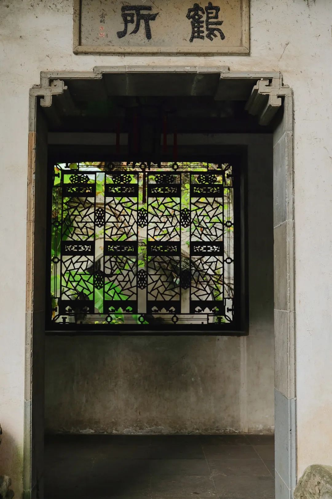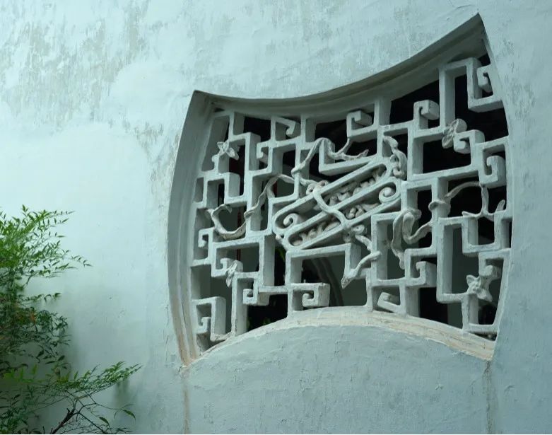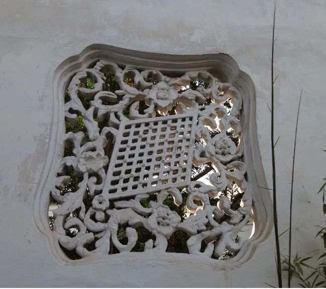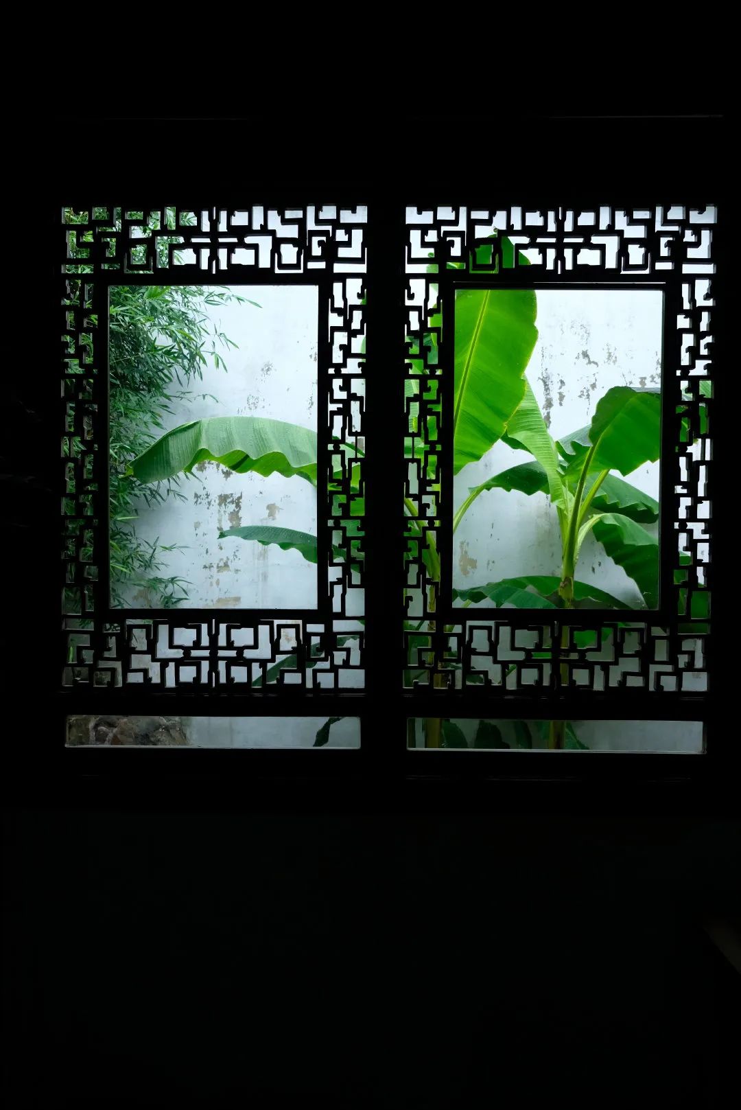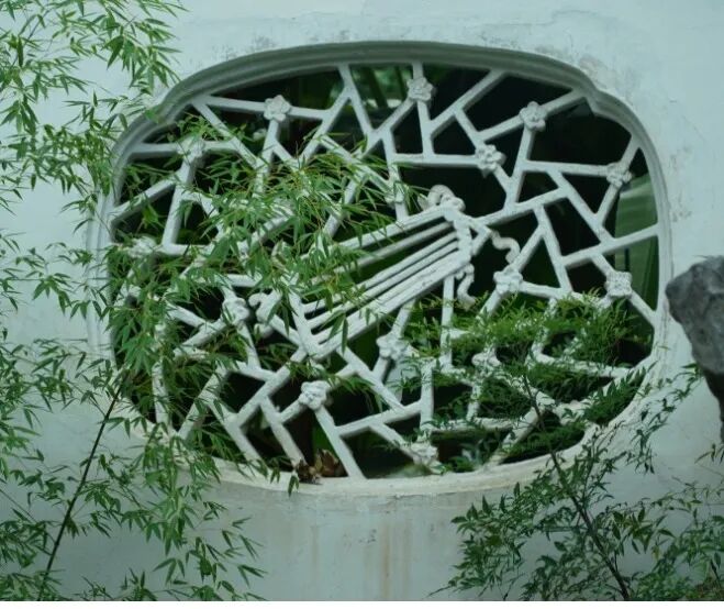 网师园殿春簃夔龙纹窗棂繁复中显古雅,中间嵌方框,又有简洁意。窗外辟小天井,立湖石,栽种芭蕉、翠竹。闲来看窗牖截取蕉、竹最为动人的意态,写入景框,也有欣赏明清小品的清趣。