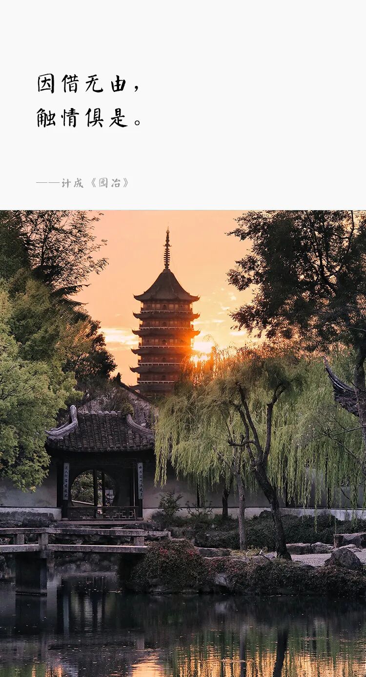 明代造园家计成说:“因借无由,触情俱是。”意思是借景没有什么定式,动人情思者,尽可借取。