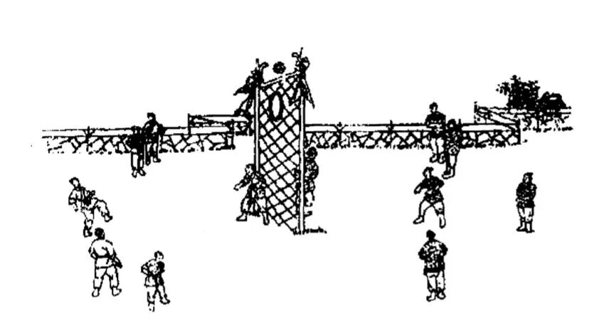 “植两修竹,高数丈,络网于上,为门以度球,球工分左右朋,以角胜负否。”