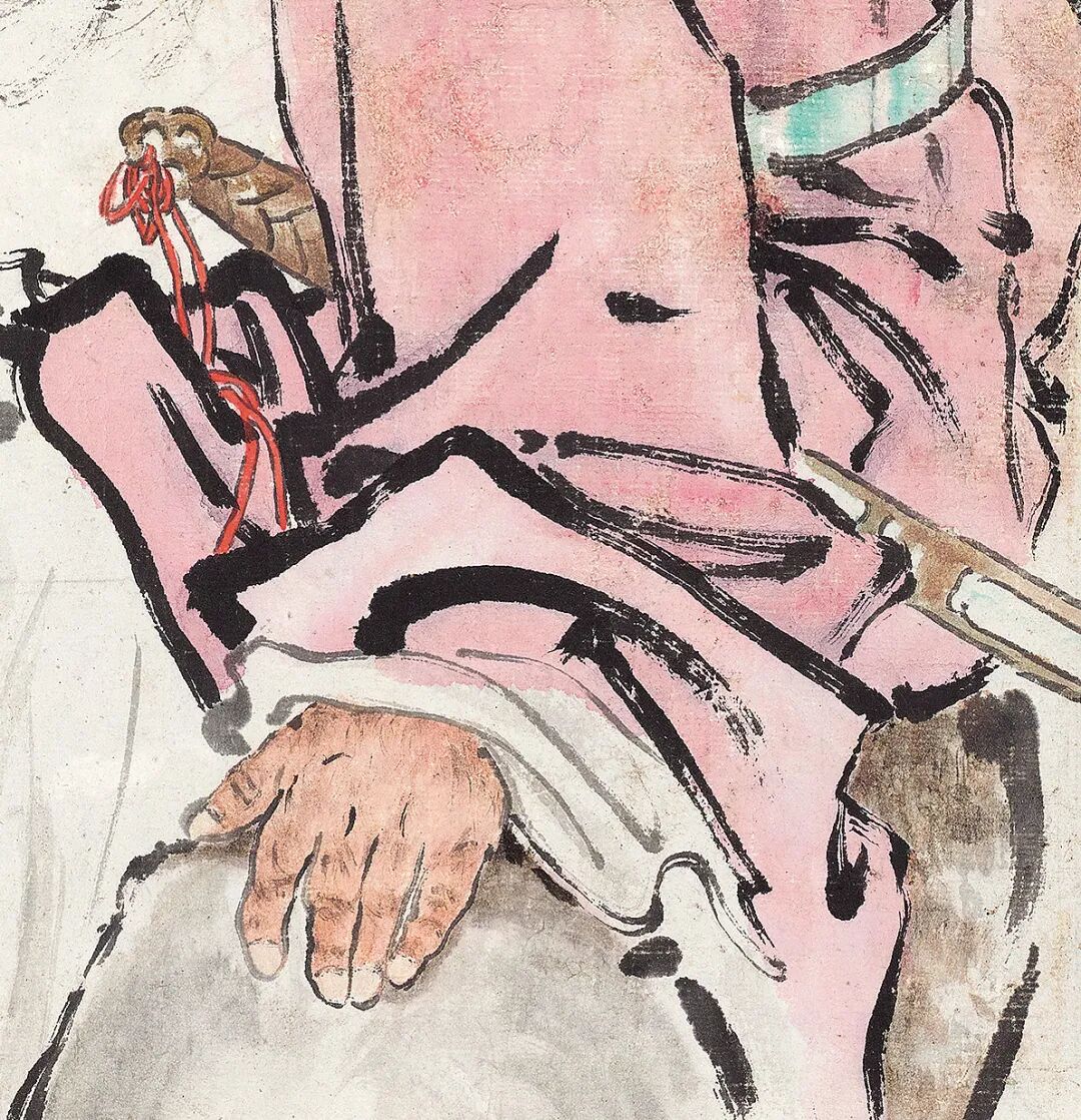 【说明】钟馗是徐悲鸿人物画常涉猎的题材。此幅《钟馗图》创作于1939年,此时正值抗日战争期间,徐悲鸿携画作赴星、马地区举办筹赈画展。画中钟馗侧身而坐,接受跪地小鬼举案恭敬献酒。小鬼的小心翼翼,与钟馗之絈目欲裂、腉沤戟张之态,鲜明对比,视觉冲击极为强烈。