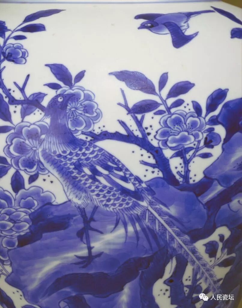 尊敞口外撇,长颈,丰肩,鼓腹,圈足,俗称“凤尾尊”。通体青花色泽浓翠艳丽。尊上下两层均有雉鸡、牡丹、山石组成的画面,匠师用分水技法表现出青花色泽与纹饰的层次感,清新明快的色阶变化所产生的韵律美,使瓷绘纹饰获得了水墨画一般鲜明、生动、传神的艺术效果。