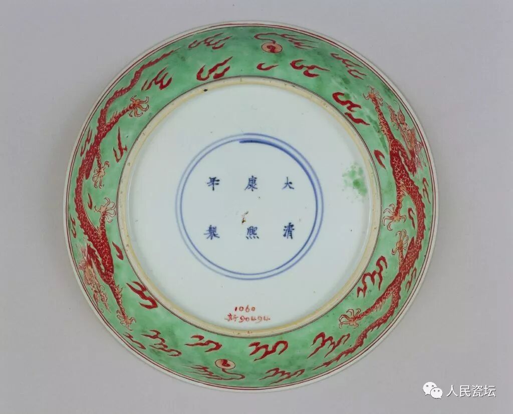 绿地红彩云龙纹盘,清康熙,高4.7cm,口径21.7cm,足径14.2cm。