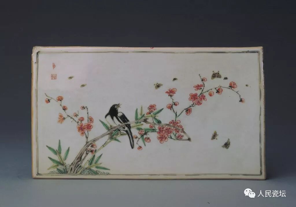五彩花鸟长方瓷板,清康熙,长25.2cm,宽14.6cm,厚2cm。
