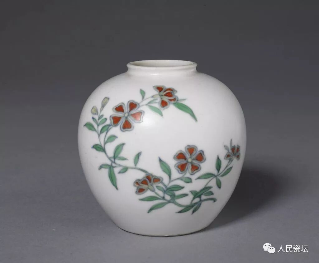 此罐造型隽秀,构图疏朗,瓶身只绘折枝石榴花,简洁醒目。釉上彩以红绿彩为主,颇显清新雅致。