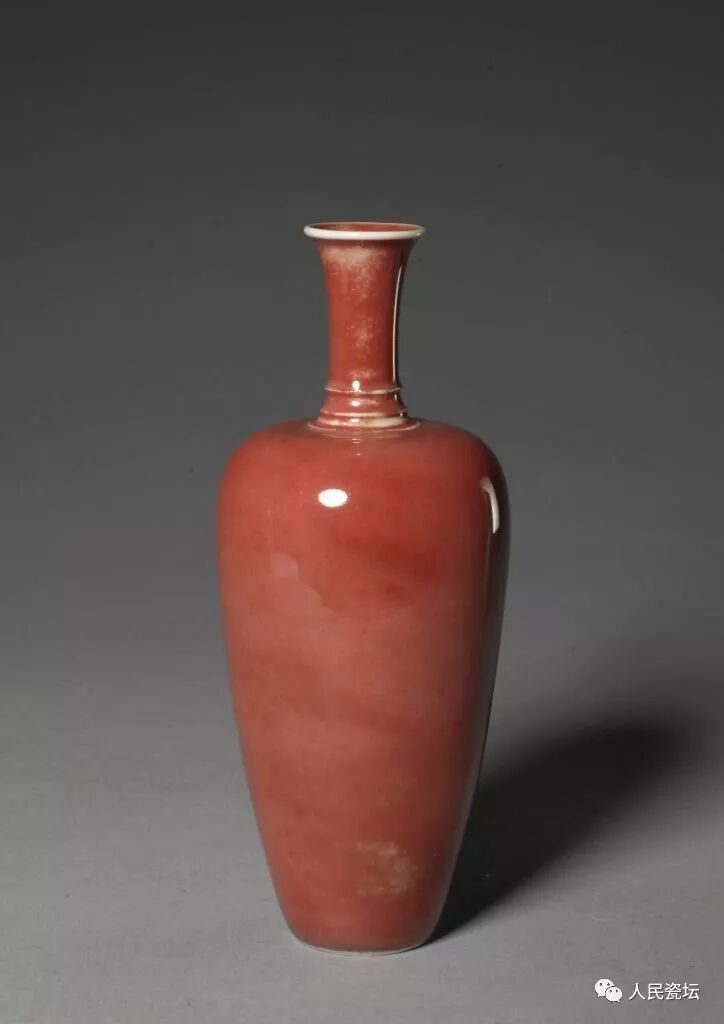 豇豆红釉莱菔尊,清康熙,高19.9cm,口径3.2cm,足径3.9cm。