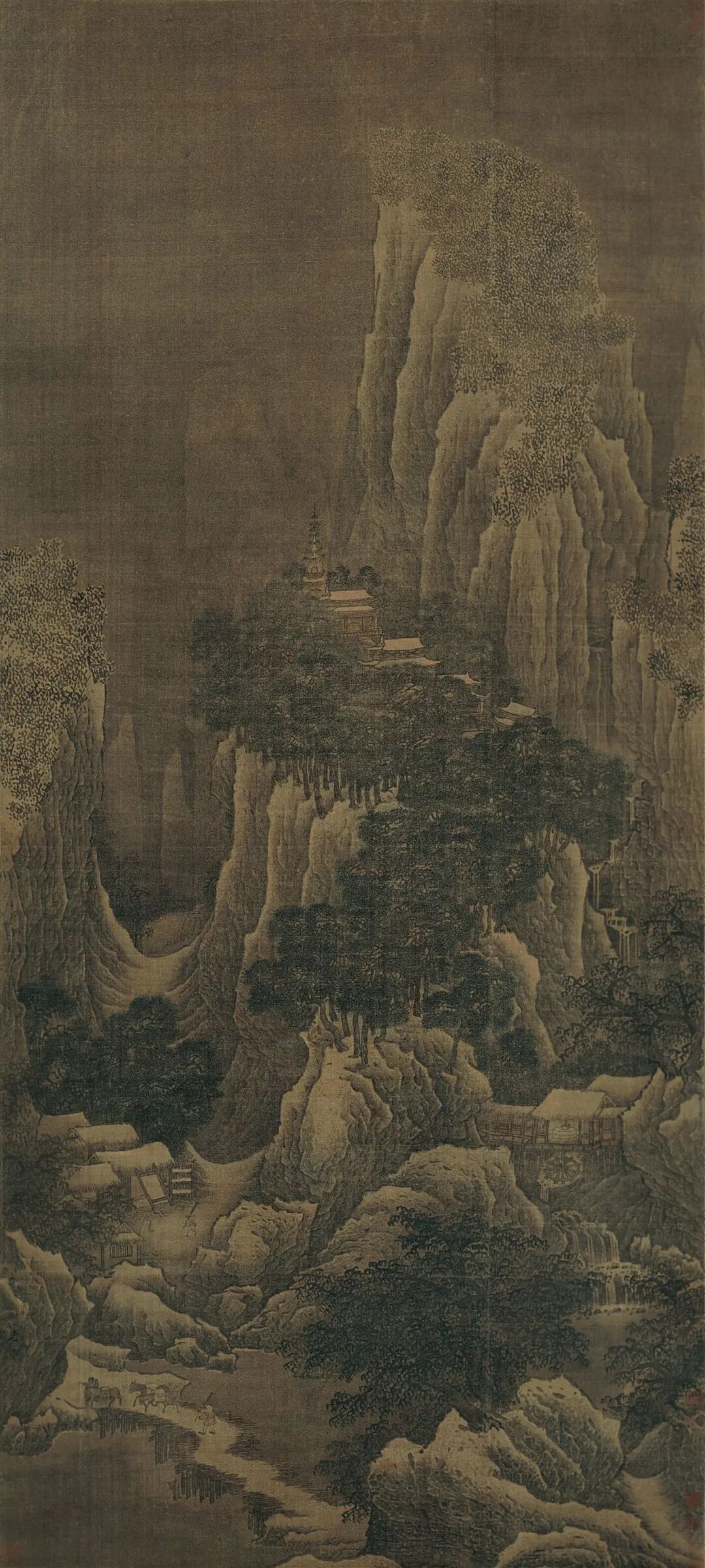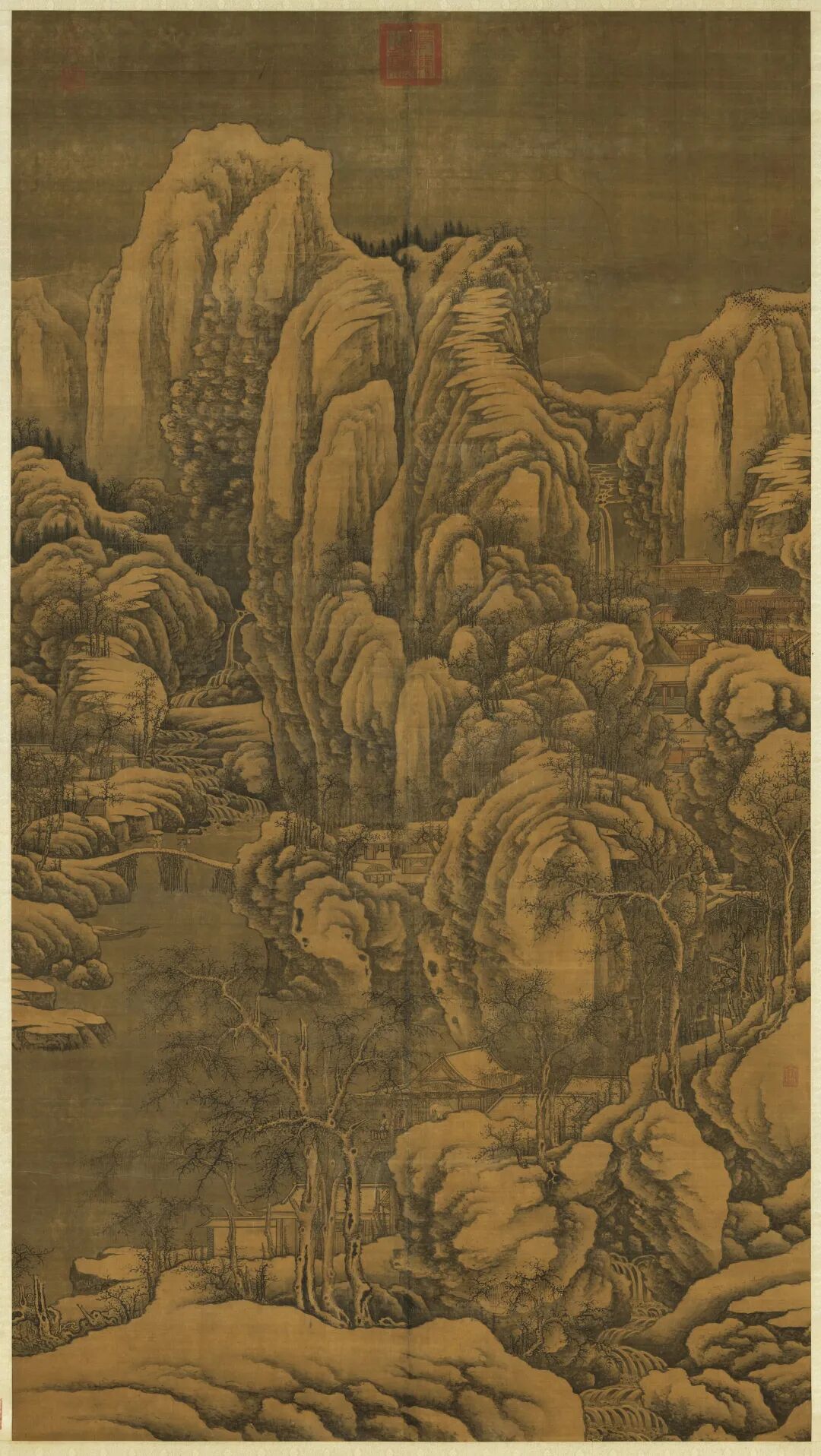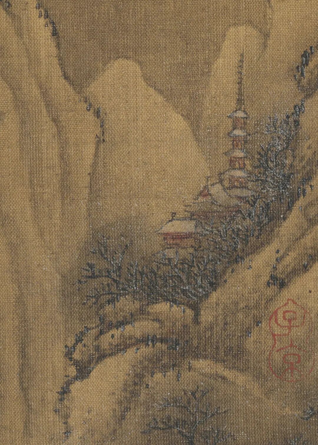 《雪山楼阁图》,现藏于波士顿美术馆。此画与《溪山行旅图》中的商旅有异曲同工之妙,左下渔夫卖鱼,山间小路上的行人冒匆匆赶路,山腰间楼阁殿宇隐现。此画皴法多是雨点皴,画中景抽绘树木,用笔遒劲,姿态各异,为画面平添生气。近处的柏树,笔法极其精彩。主峰作寒林密布,如茸似毯,密而不乱。是一幅非常优秀的宋代精品。