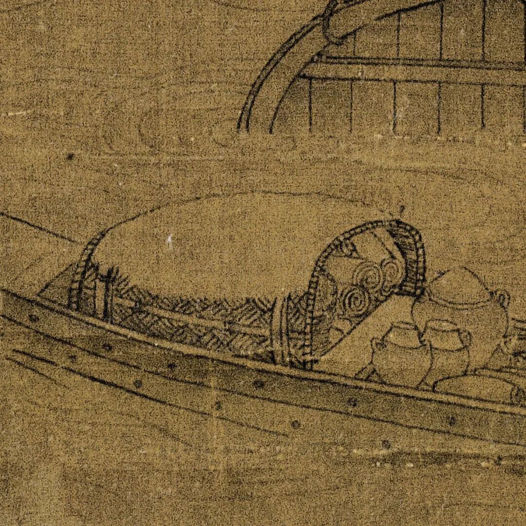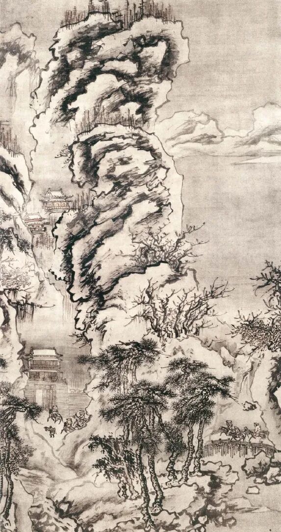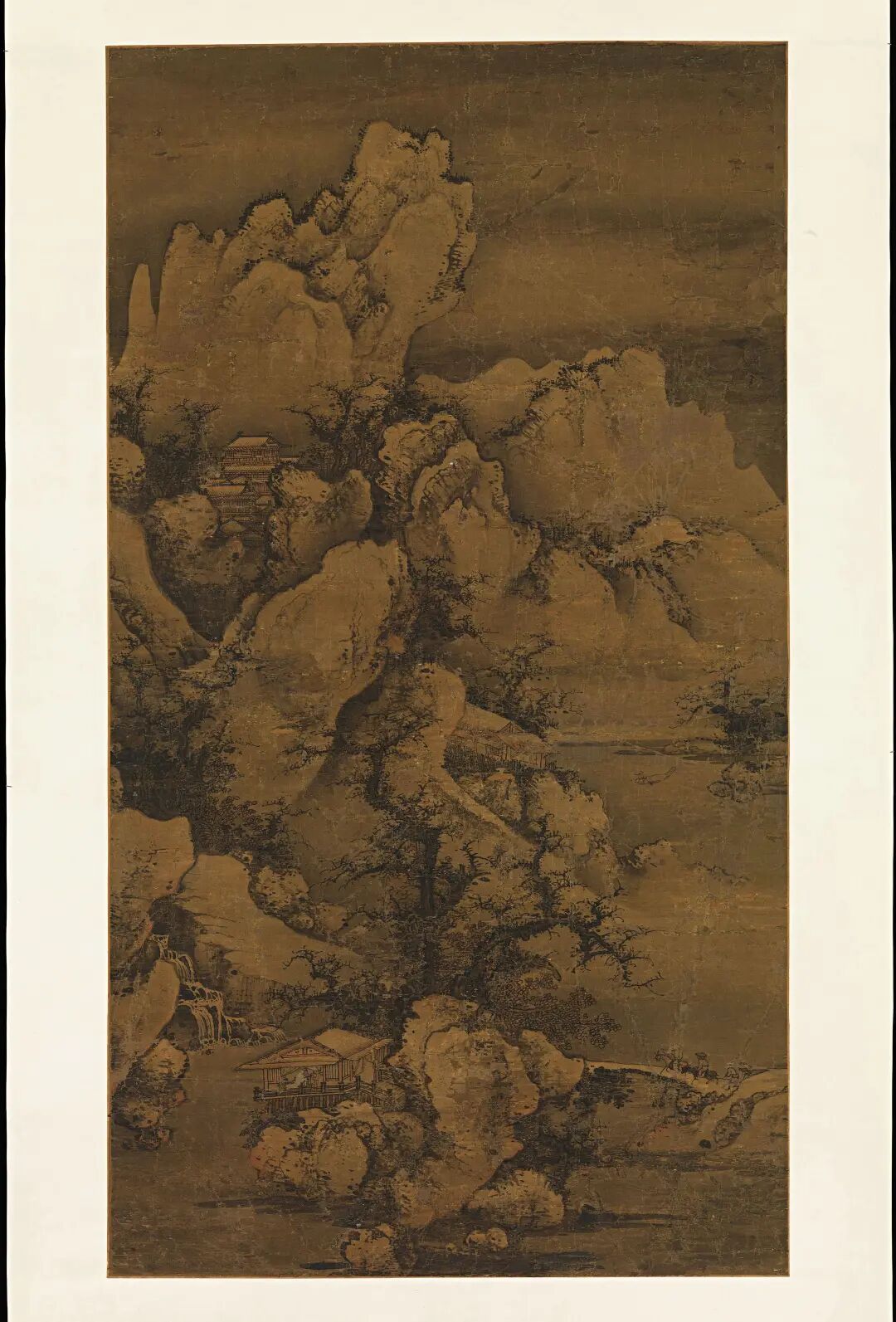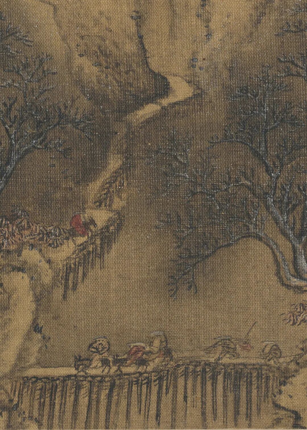 《雪山楼阁图》,现藏于波士顿美术馆。此画与《溪山行旅图》中的商旅有异曲同工之妙,左下渔夫卖鱼,山间小路上的行人冒匆匆赶路,山腰间楼阁殿宇隐现。此画皴法多是雨点皴,画中景抽绘树木,用笔遒劲,姿态各异,为画面平添生气。近处的柏树,笔法极其精彩。主峰作寒林密布,如茸似毯,密而不乱。是一幅非常优秀的宋代精品。
