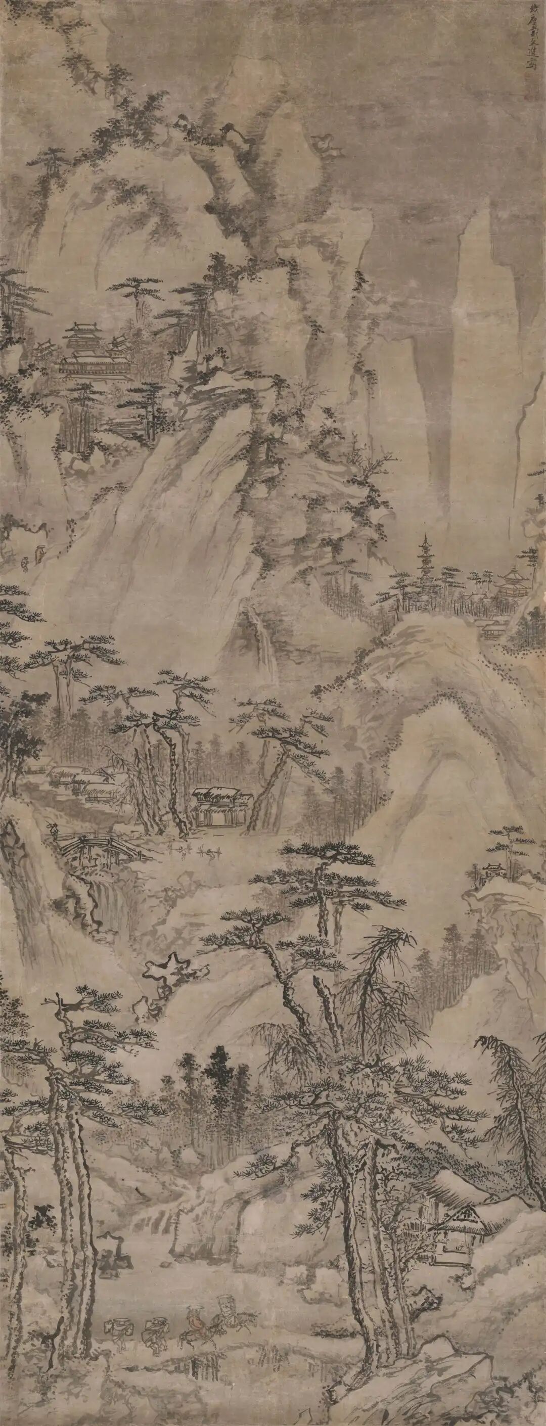 戴进的《雪山行旅图》是明代雪景绘画的经典之作,为纸本设色的大幅立轴,颇有气势。图绘群山巍峨高耸,古松参天,林壑幽深,山间溪流飞瀑,屋舍参差,有骑驴的行旅,荷担的樵夫,峰高路险处寺院隐于松林之中。此图将世俗的田园生活与清静无尘的修道之地融为一体,构思巧妙。