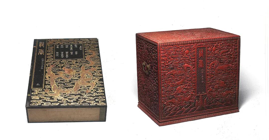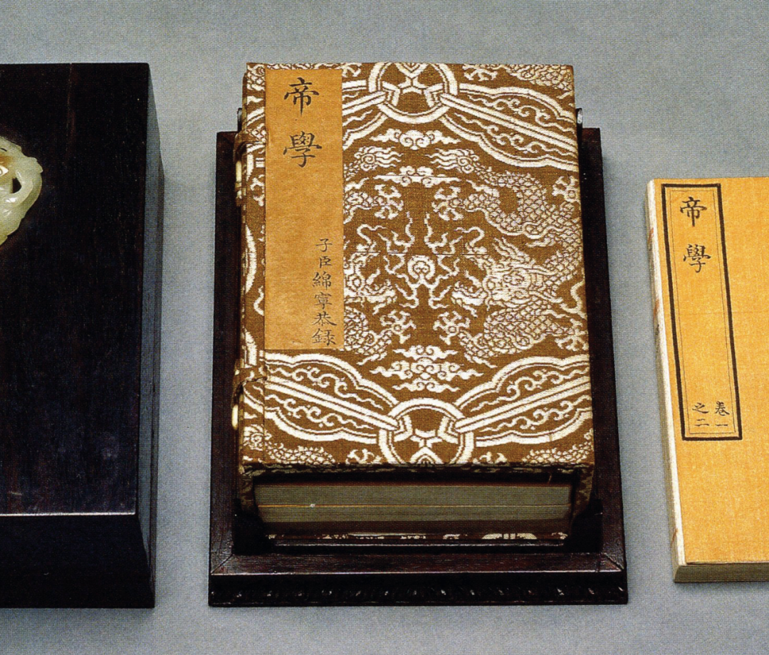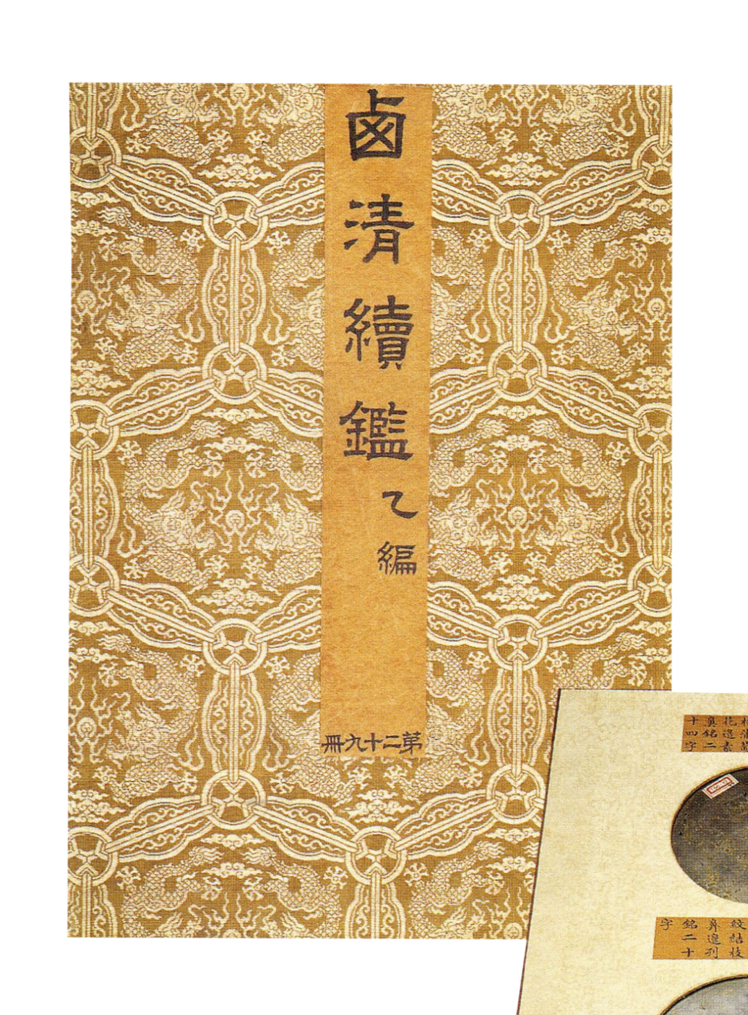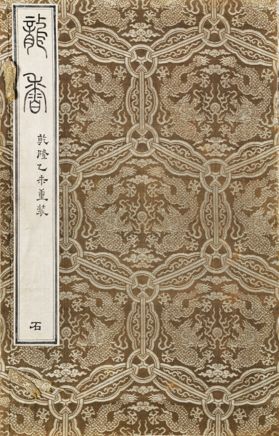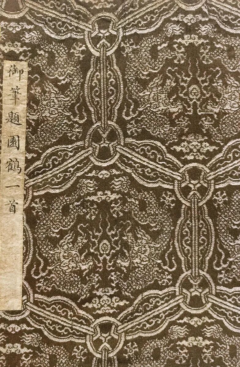 清宫用织造类装裱材料的品种繁多,其中丝织品、棉织品因兼有质地坚韧、外表美观的特性,因此广泛使用于经书、古籍、册页等书衣,或墨品、纸品等保护匣盒之上,如北京、沈阳以及台北三地的故宫博物院所藏,所用织物有缂丝、妆花、绫、绸、缎、锦。其中如本品所用的香色双龙盘绦纹二色锦,与北京故宫博物院所藏之《西清续鉴》、《“帝学”手写袖珍本》等的书皮所用织锦纹饰相同,为典型清宫所用之物,清初所见,至嘉庆渐少。