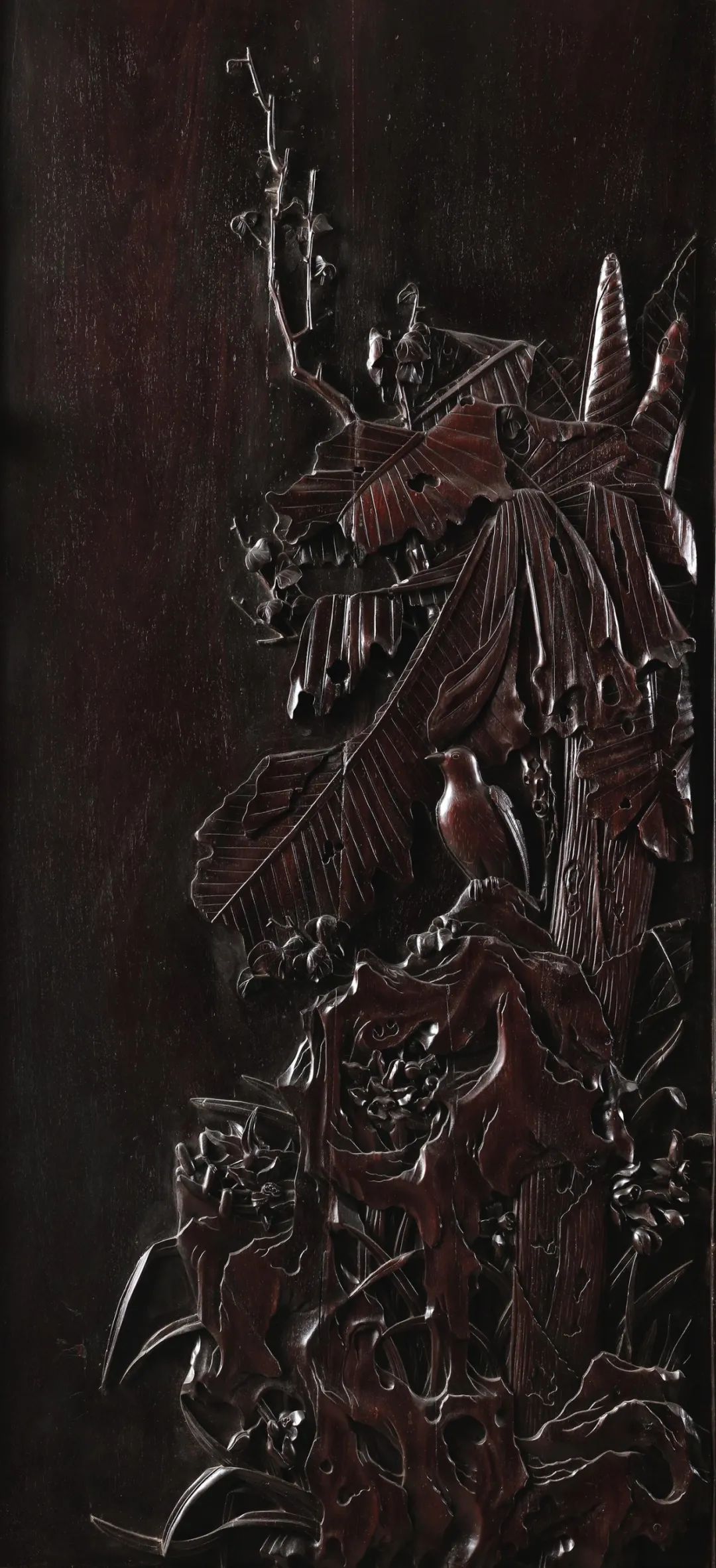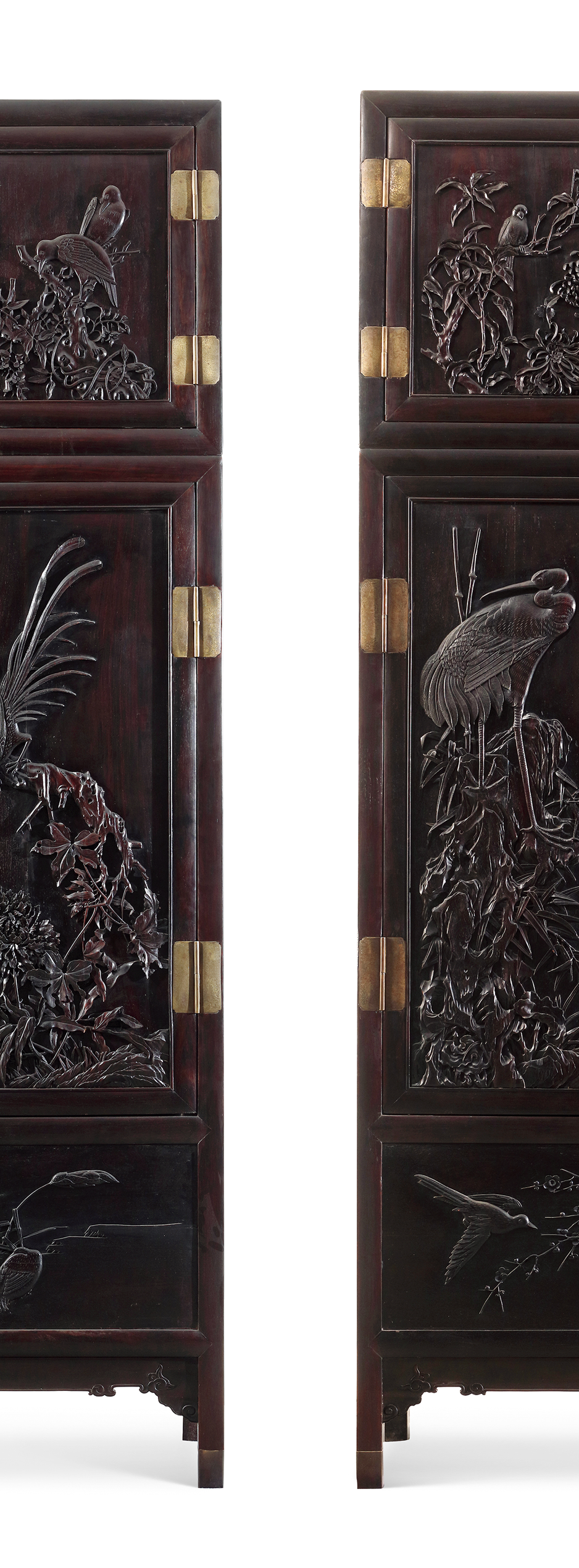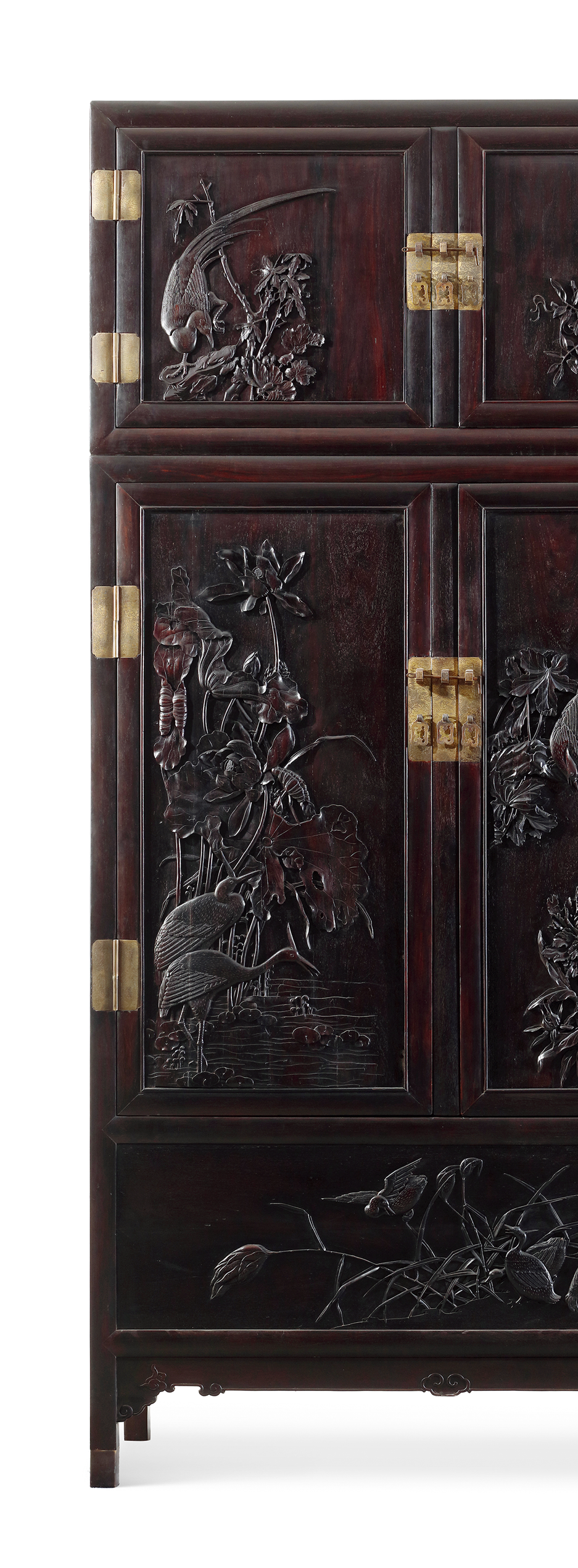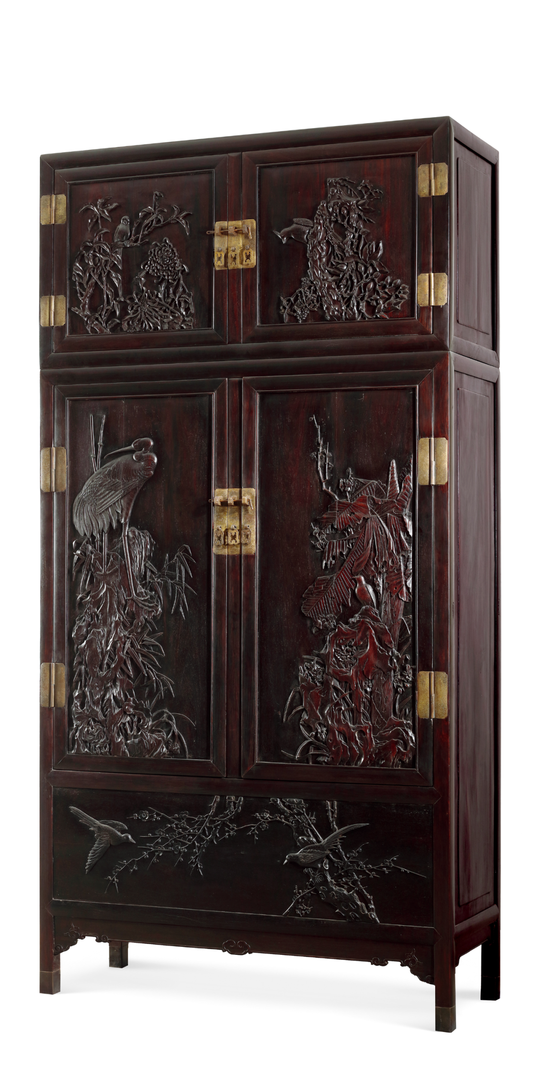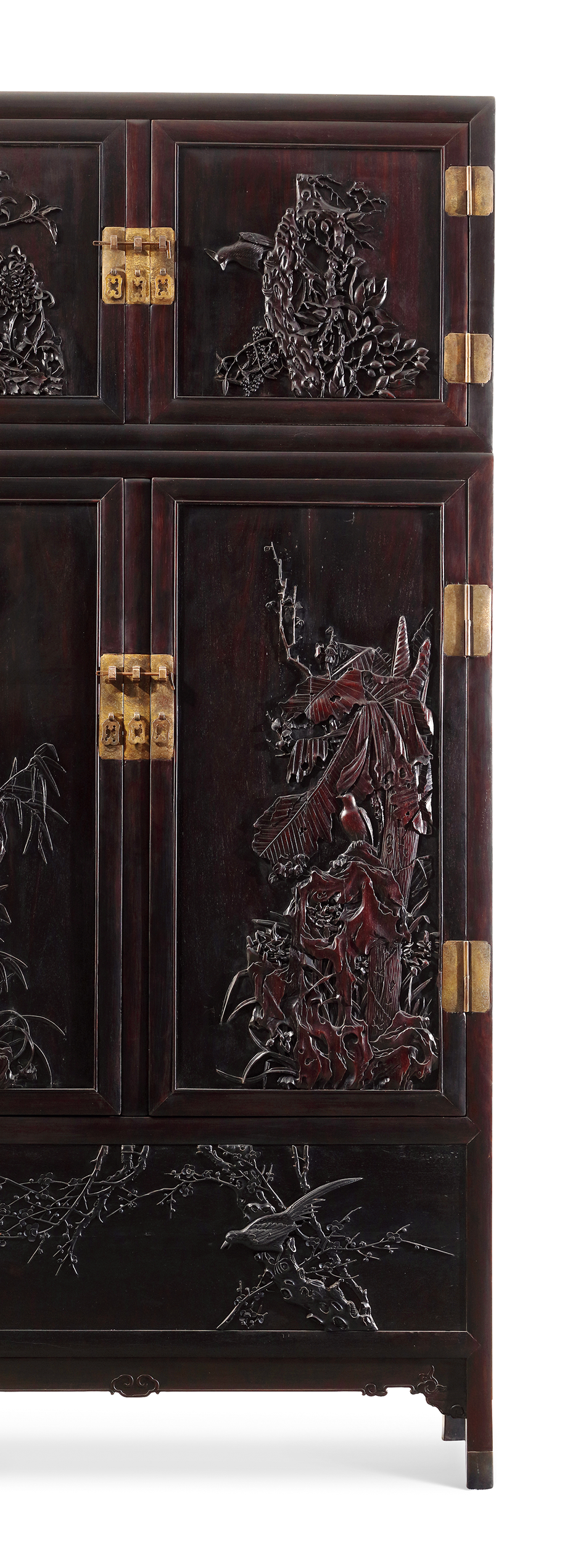 此件紫檀花鸟纹大四件柜在存世的紫檀家具中占有极为重要的地位,原因在于:今存于北京故宫的数件紫檀大柜雕刻图案多为云龙纹和图案规矩、装饰化的博古花卉纹样,而本件大柜则每扇柜门均能独立成画,是宫廷画师与紫檀工匠的完美合作,堪称家具中的“珐琅彩”。令人恍如置身圆明园中乾隆帝华美雍容的起居室中。根据田家清《清宫圆明园家具初探》一文,这类流散民间的紫檀宫廷家具极可能是圆明园流散之珍。