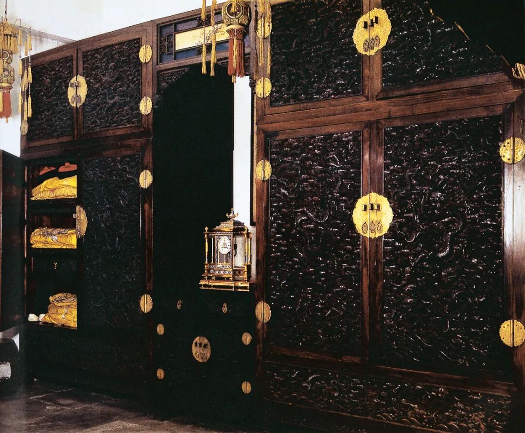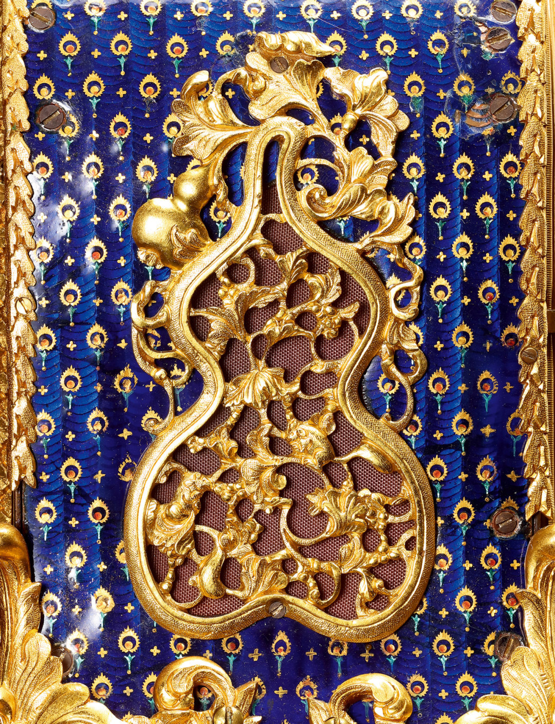 此柜的金属饰件相当讲究,底足包铜套,柜膛翻板有铜提环,合页、面叶造型典雅,錾刻图案精美,鎏金均匀,金色的鎏金饰件与紫檀柜体色泽反差强烈,既富装饰效果,又能冲淡大型家具给人的沉闷感。此器清末民国时期为前清内务府重臣庆小山家族珍藏,早年即闻名京师久矣。柜子成对保存完好,是十分难得的存世清代宫廷家具重器。据田家青先生《缅怀老一代明清家具收藏家》一文,庆氏家具收藏以宫廷紫檀黄花梨大柜着称,除此对紫檀四件柜外,著名的黄花梨雕云龙大四件也是庆家藏品。庆小山(1848-1927),名宽,号松月居士。隶正黄旗。工书善画,供职于醇亲王府,由醇亲王府进入清宫内务府,历任内郎、堂郎中、晋三院卿,三院指上驷院、武备院、奉宸院,属正三品。自此庆宽被慈禧太后钦派办理宫廷大典、领衔绘制紫光阁宫廷历史绘画、宫廷肖像及陵寝礼图等,成为一名内务府重臣。在光绪时期筹备圆明园的重建,并在庚子事变后奉慈禧之命负责散落宫外的器物的重新收集工作。庆宽家族的明清官窑收藏,也是百年来北京最重要的收藏之一。