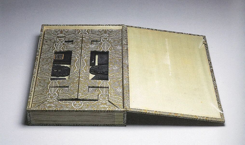 本套御墨的包装当为清廷的宫廷造办处所制,其黑漆描金云龙纹匣盒可谓漆器工艺品中的精品,而漆盒内的函匣又以贴锦装饰,各种工艺门类的交织合作,可谓匠心独具,蕴含着一个时代特有的内涵,使观者领略到其艺术魅力,值得珍藏永久。
