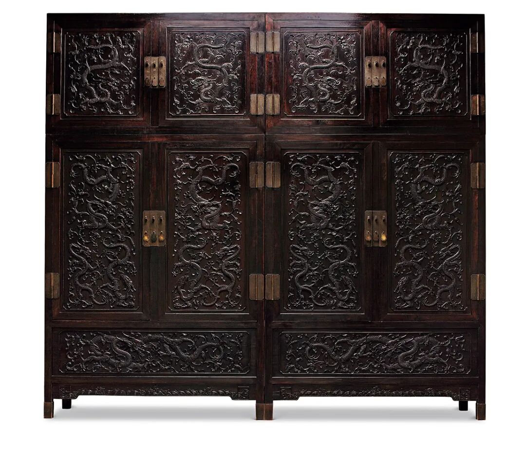 清乾隆 紫檀高浮雕九龙西番莲纹顶箱式大四件柜