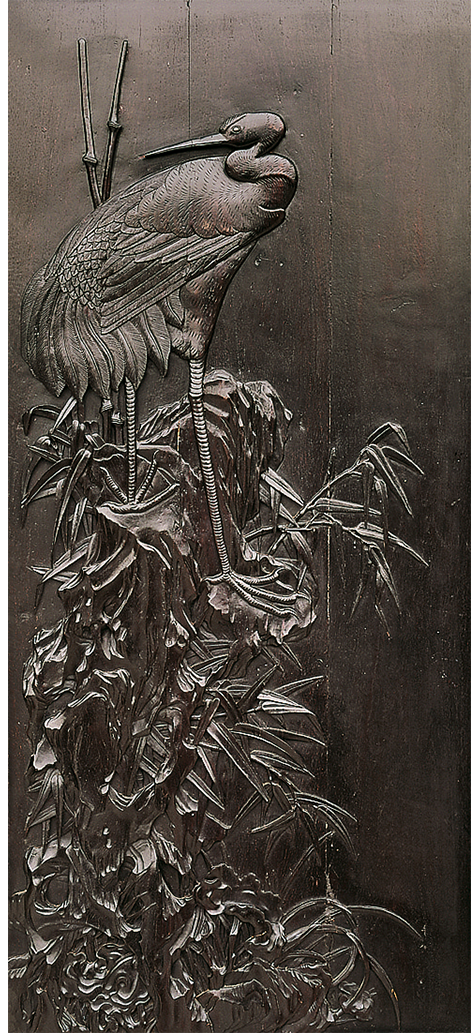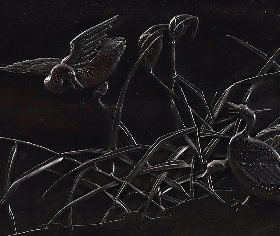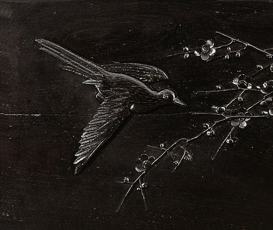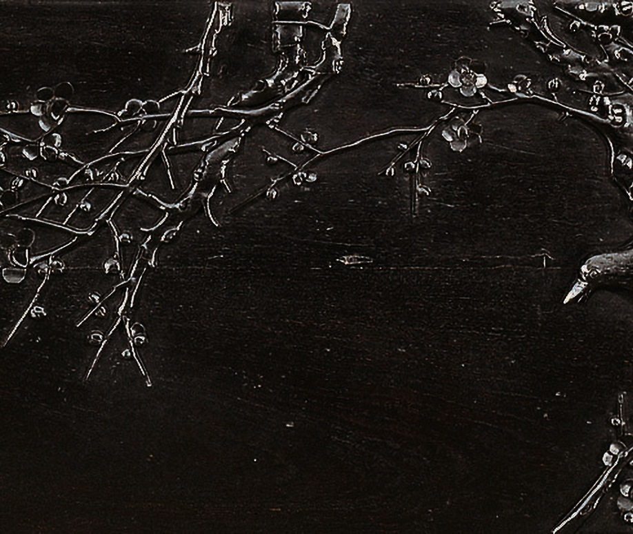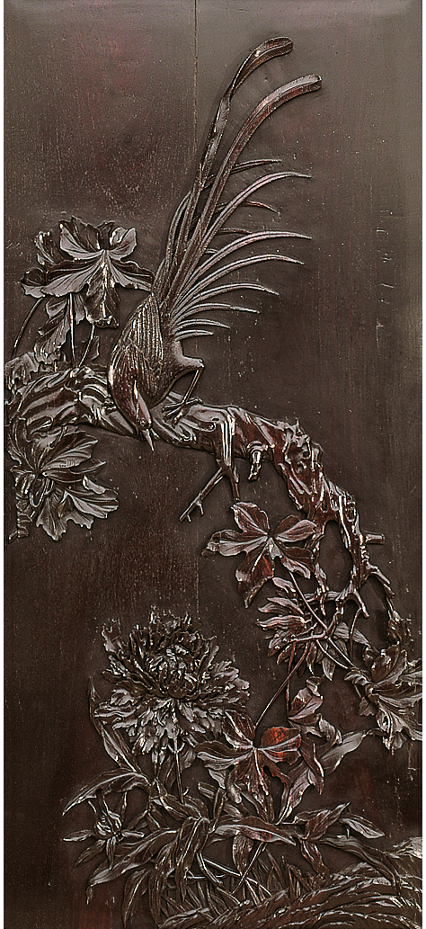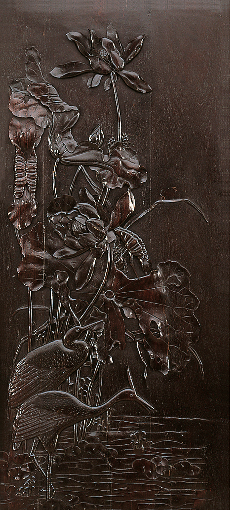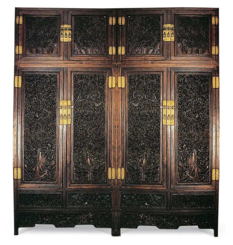 此柜最夺目之处是八扇柜门和柜膛立板的铲地高浮雕,工艺精湛,栩栩如生。八扇雕花柜门整体上给人以繁花似锦、气度威严的震撼力。“铲地”高浮雕是清代“大内紫檀作工”的特有工艺,即将图案之外的底子全部铲平,使图案突现,立体感强烈。与一般硬木家具的“起地”浮雕法相比,同样的图案,“铲地”浮雕需要多几倍工时。宫廷紫檀家具的浮雕地子平整如镜,令普通工匠可望而不可及。
