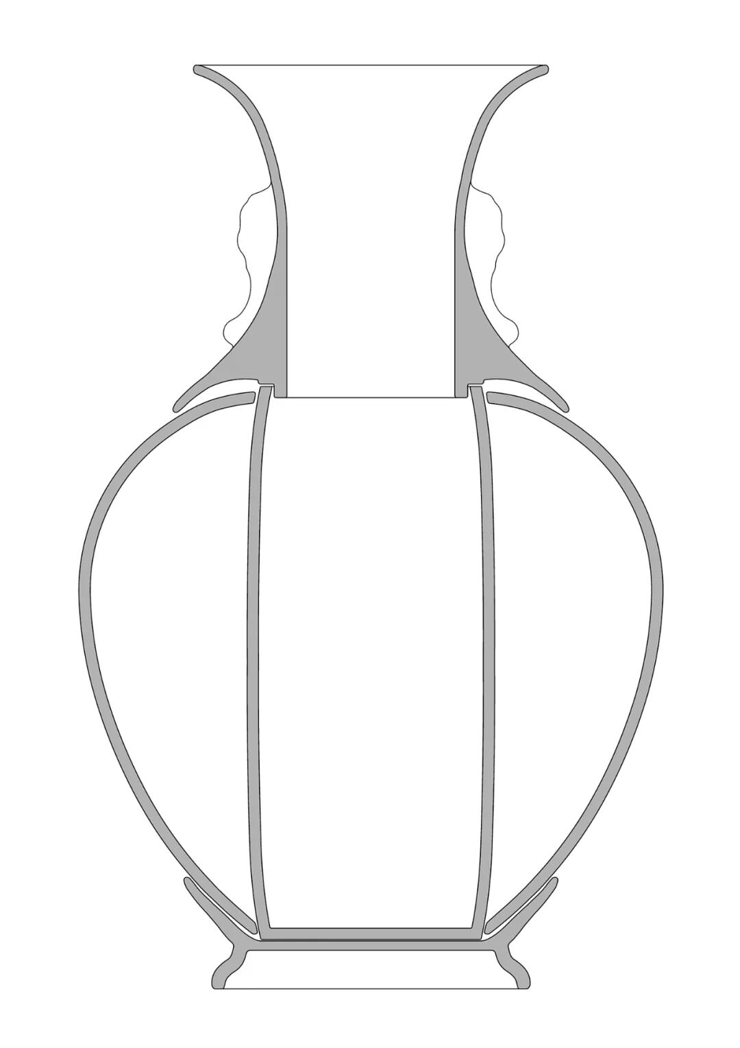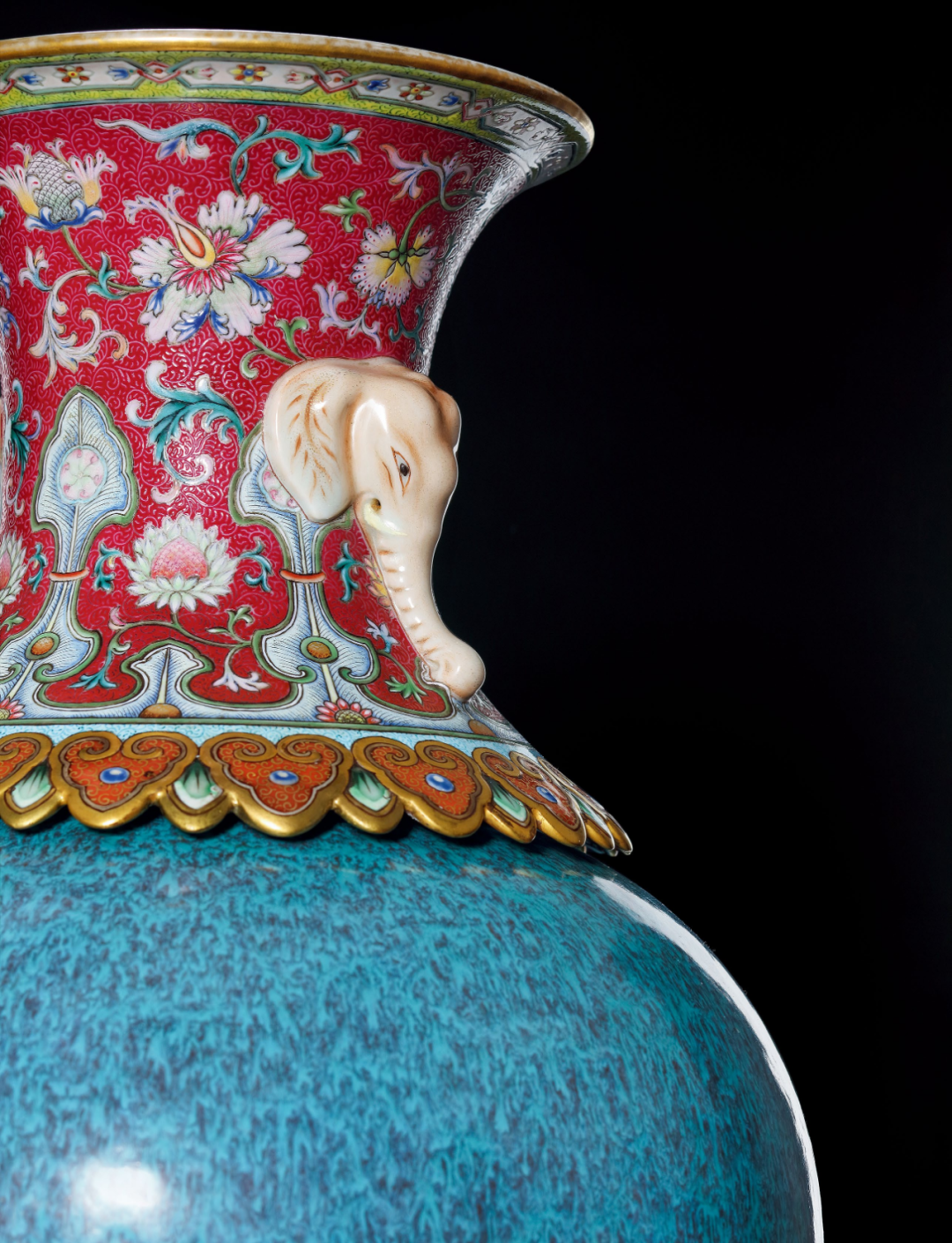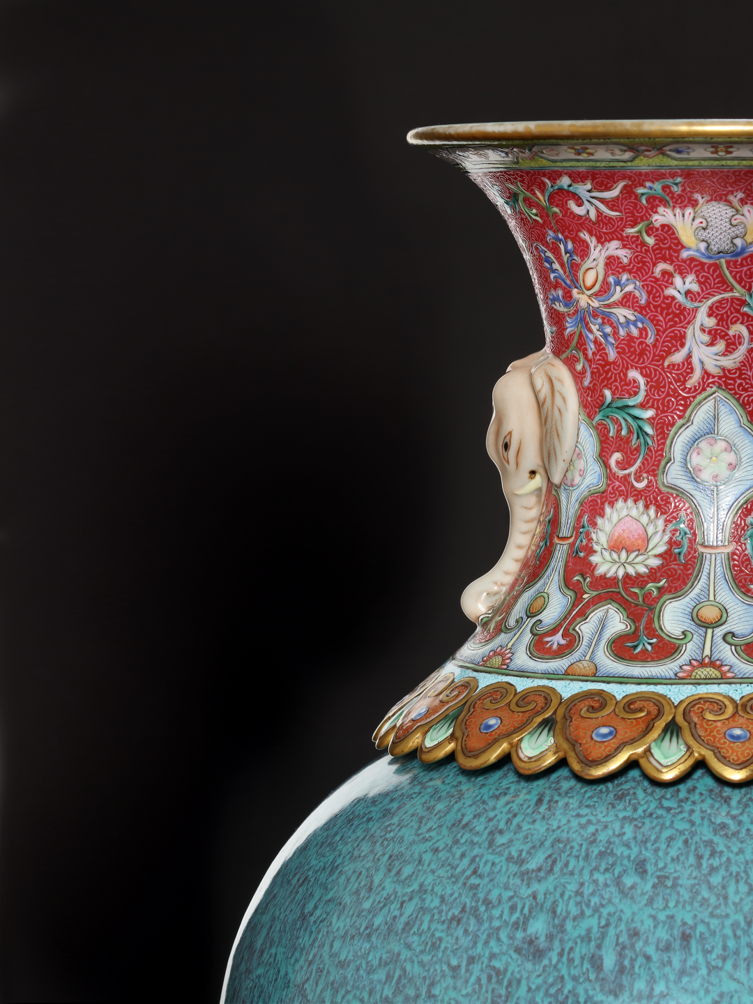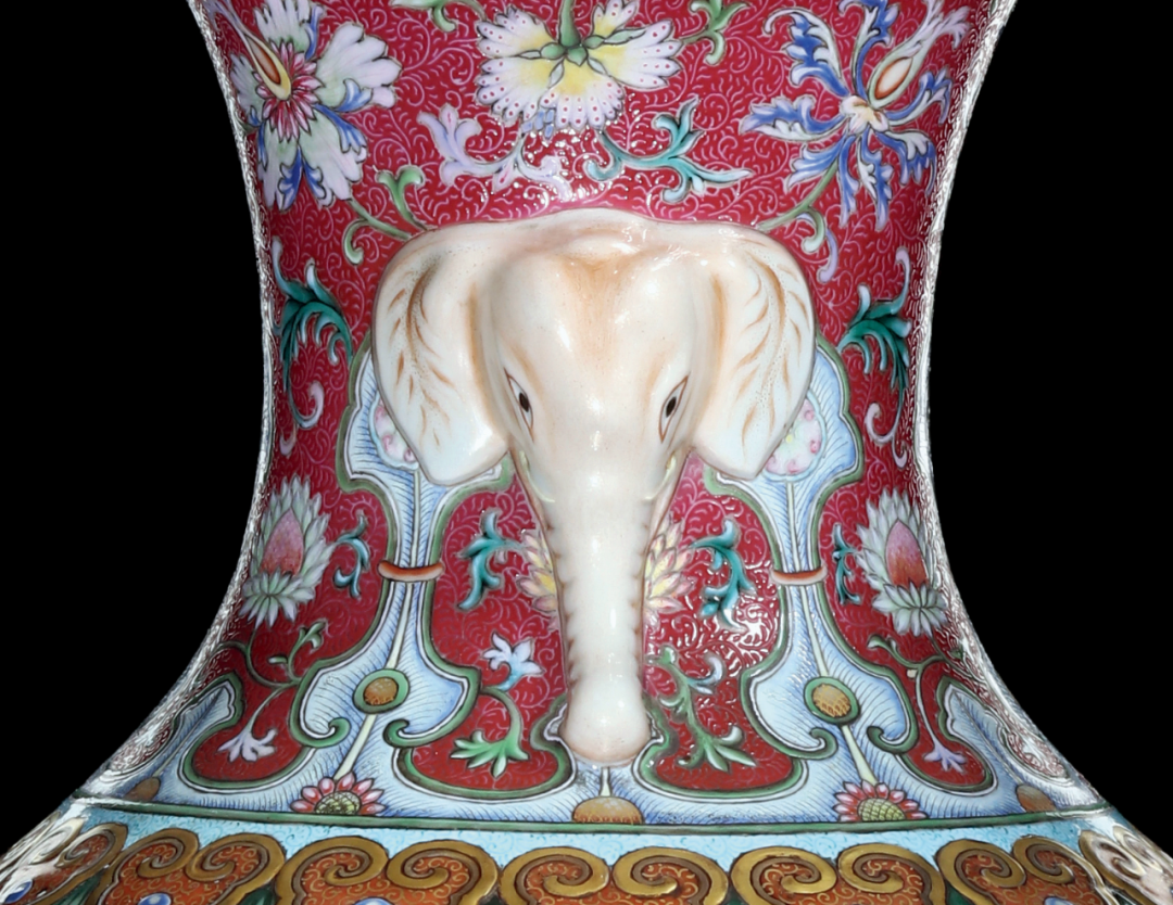 本器撇口束颈,两侧各饰一象耳,丰肩鼓腹,足部外撇。口足皆以胭脂红釉为地,轧道工艺锥剔凤尾形卷草纹,锦地华美繁丽;其上衬洋彩花卉,洋莲曼妙婉转,菊花及变形蕉叶纹间隔而饰,肩部、胫部凸雕如意云纹各一周,金灿光艳;两侧象耳栩栩如生,彩绘细腻,毫发毕现,眼含悦乐;腹部饰炉钧釉,红紫、蓝绿交融激荡,釉色近雍正时期特色。足内青花书“大清乾隆年制”六字三行篆书款。