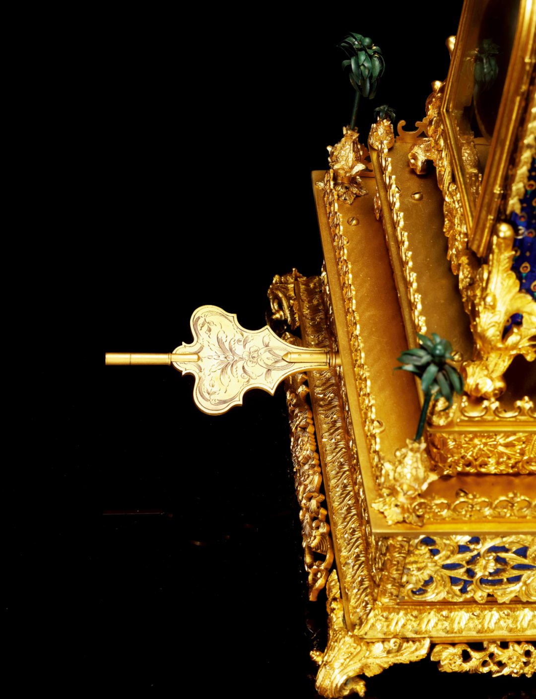 这件“清乾隆-嘉庆 铜鎏金御题诗西洋游戏人物钟”的御制诗是嘉庆皇帝没有登基之前作为皇子的时候写的。台北故宫博物院同样有一块带有嘉庆皇帝御题诗的表,表中的诗句为:“昼夜功无间,循环二六时。枢机迭轮转,分刻细迁移。”台北故宫博物院馆藏的这块表中的御题诗则是嘉庆皇帝登基之后所作。这首诗的全文比这件“清乾隆-嘉庆 铜鎏金御题诗西洋游戏人物钟”上的诗文要长。可以看出,嘉庆皇帝对于钟表有某种特殊的感情,同样也将钟表视为宫廷生活中的一部分。