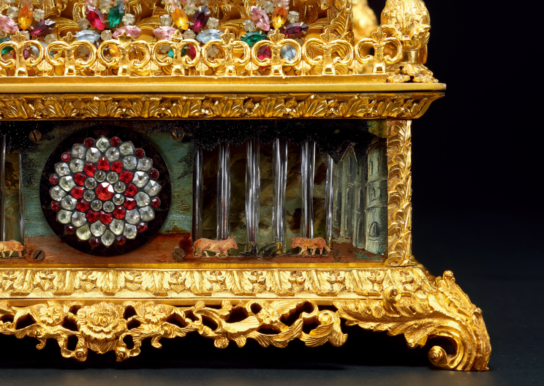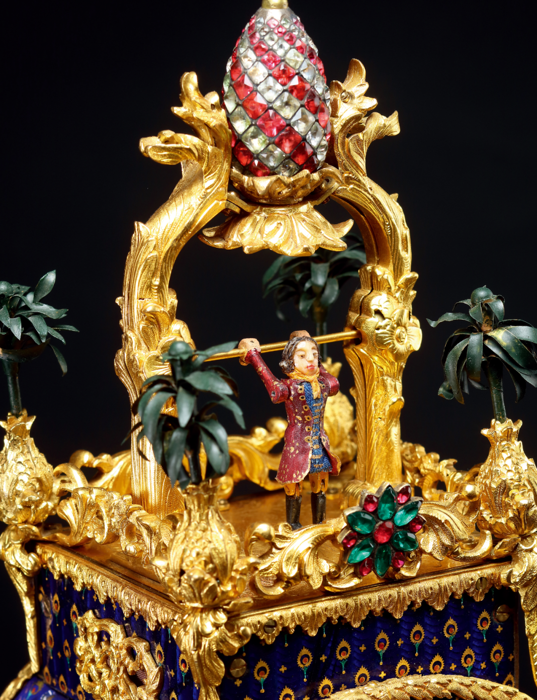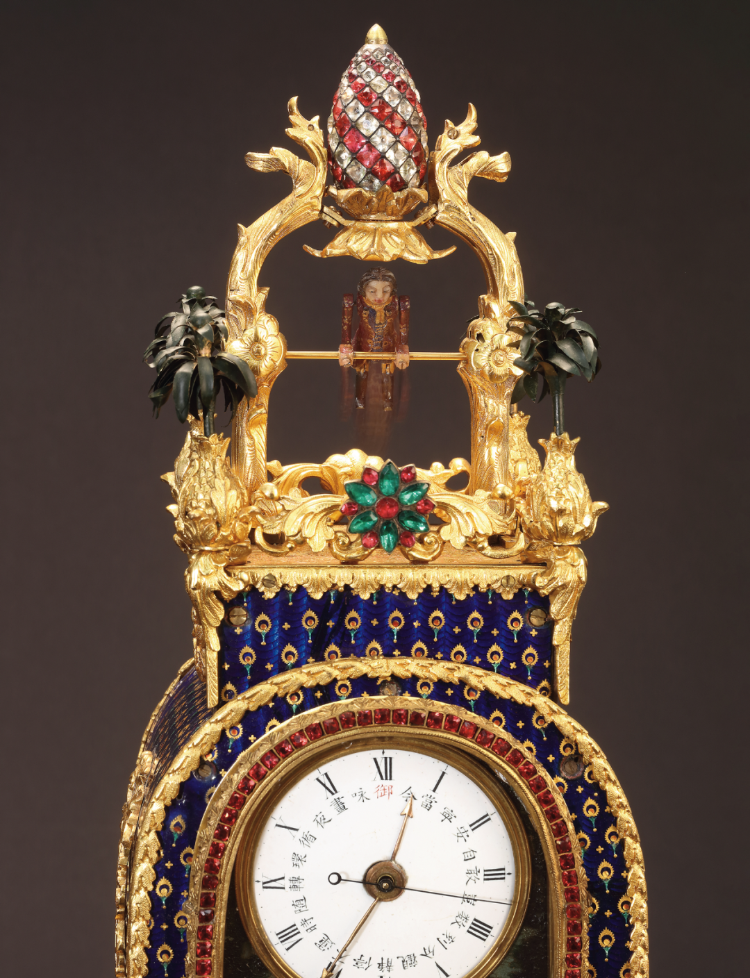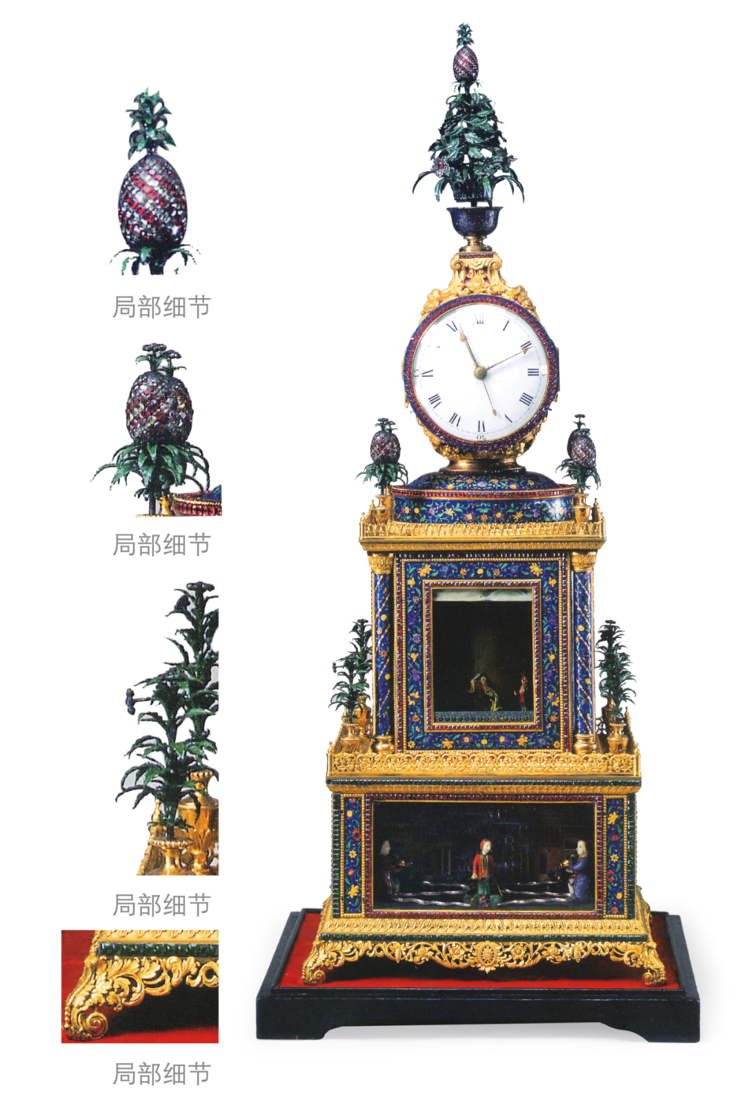 钟表的顶部是一个菠萝,17世纪,一位名叫卜弥格的传教士写了一本《中国植物志》。这本《中国植物志》里记录了菠萝的影像,后来这本书传到了西方,西方人认为中国的菠萝非常特别,之后,便把菠萝的作用发挥到了极致。这件“清乾隆-嘉庆 铜鎏金御题诗西洋游戏人物钟”就是很好的体现。此外,菠萝元素还被引申为中国特有的风土人情。