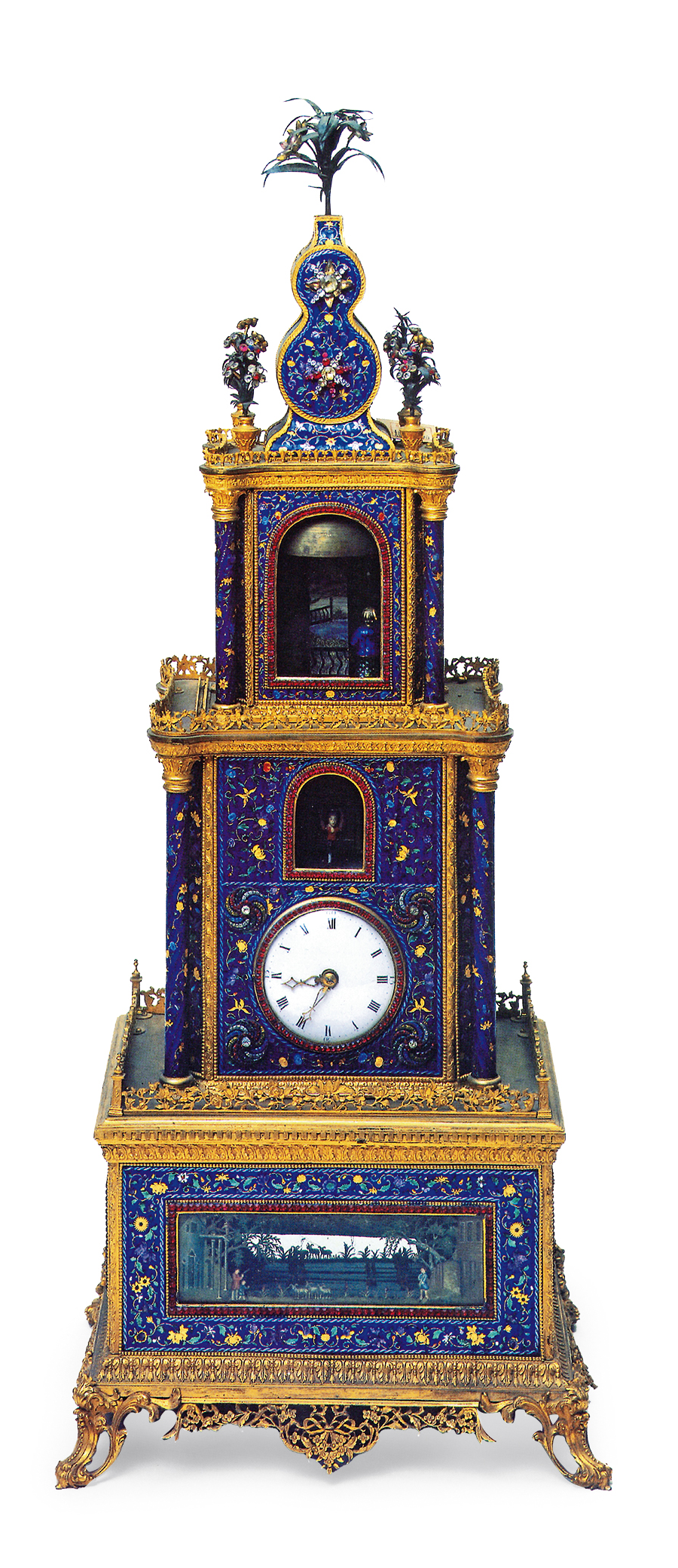 清乾隆 铜镀金珐琅楼倒球卷帘钟(广州)