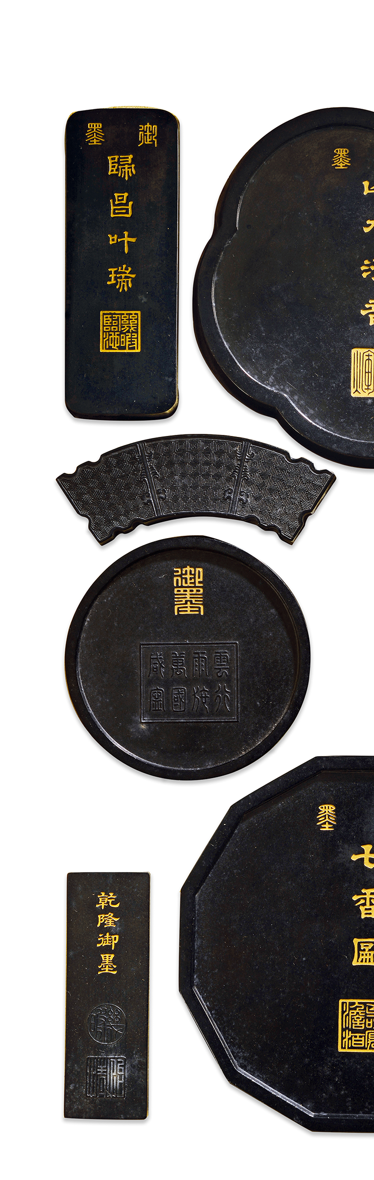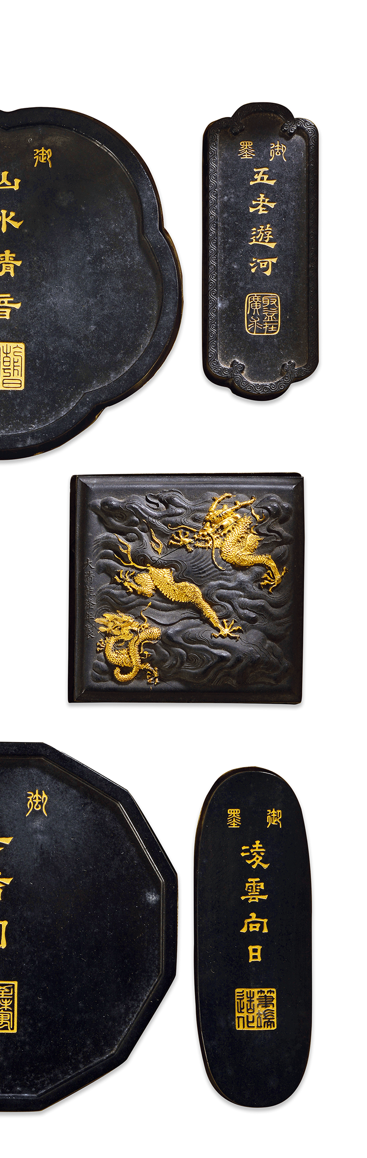 墨之收藏尤为重要,因其材质易脆易碎,其包装要在美观的同时更重安全性,如同本套御墨,随形挖槽的锦盒之外,再套黑漆描金匣,造型精巧,安全稳妥且便于保存,这里便涉及到清宫精致华美的“包装艺术”。
