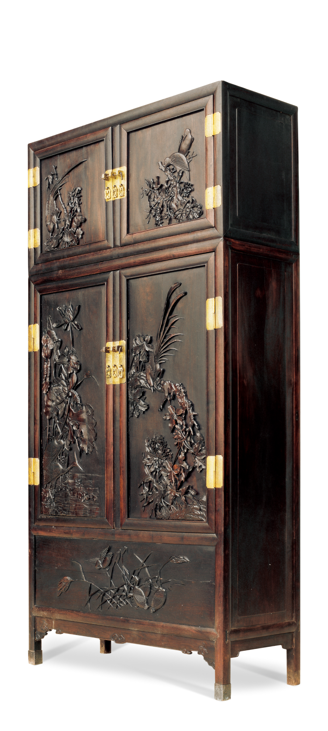 清乾隆 紫檀高浮雕四季花鸟顶箱式大四件柜