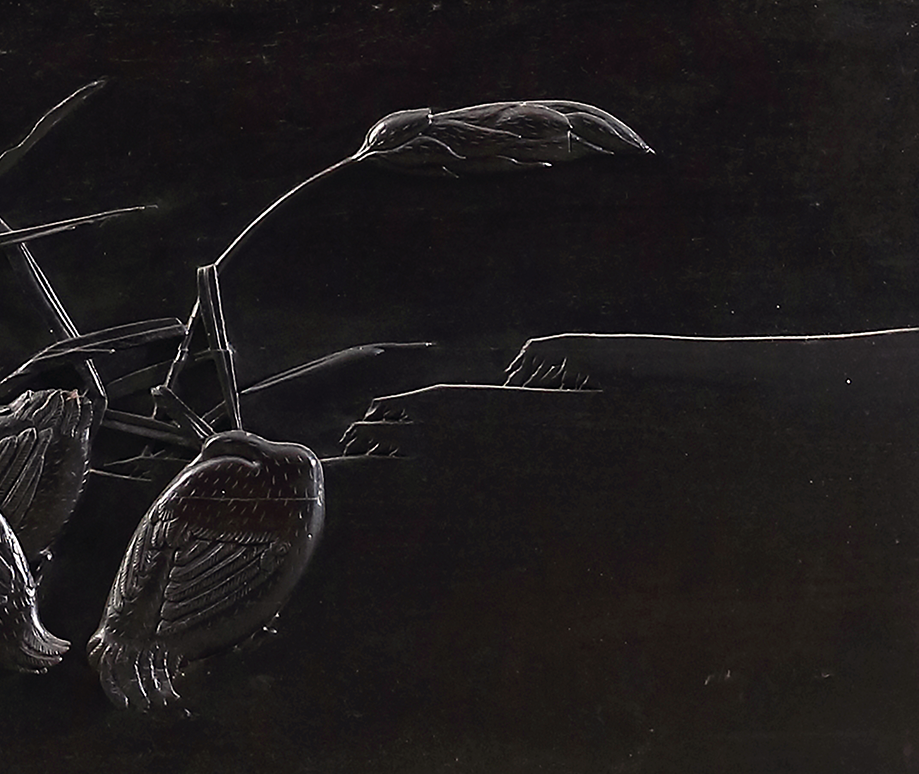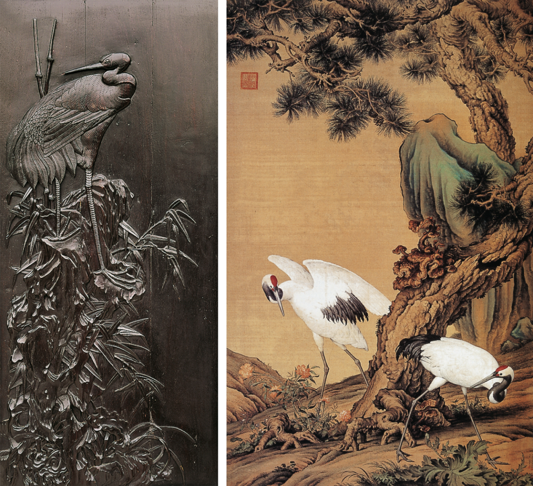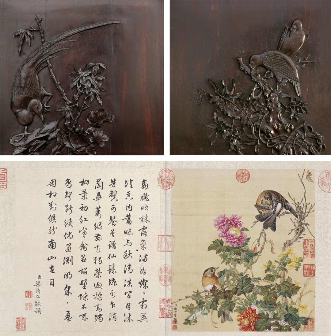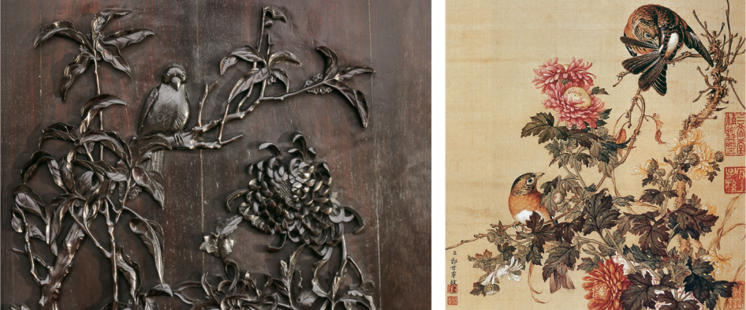 紫禁城皇帝与后妃寝宫家具中的数件紫檀大柜雕刻图案多为云龙纹和图案规矩、装饰化的博古花卉纹样,有的甚至以郎世宁花鸟画为蓝本刻成。柜顶柜门上的一扇“菊花画眉”图,对比郎世宁的花鸟册中的一页,构图和题材相同,在花瓣、枝叶的表现技法上风格完全一致,透视准确,造型写实极富于立体感。锦鸡、仙鹤的纹样亦可与朗氏作品一一对应。可见此柜的画稿出自受郎世宁画风影响的宫廷画师之手,具有中西结合的圆明园宫廷艺术特点。