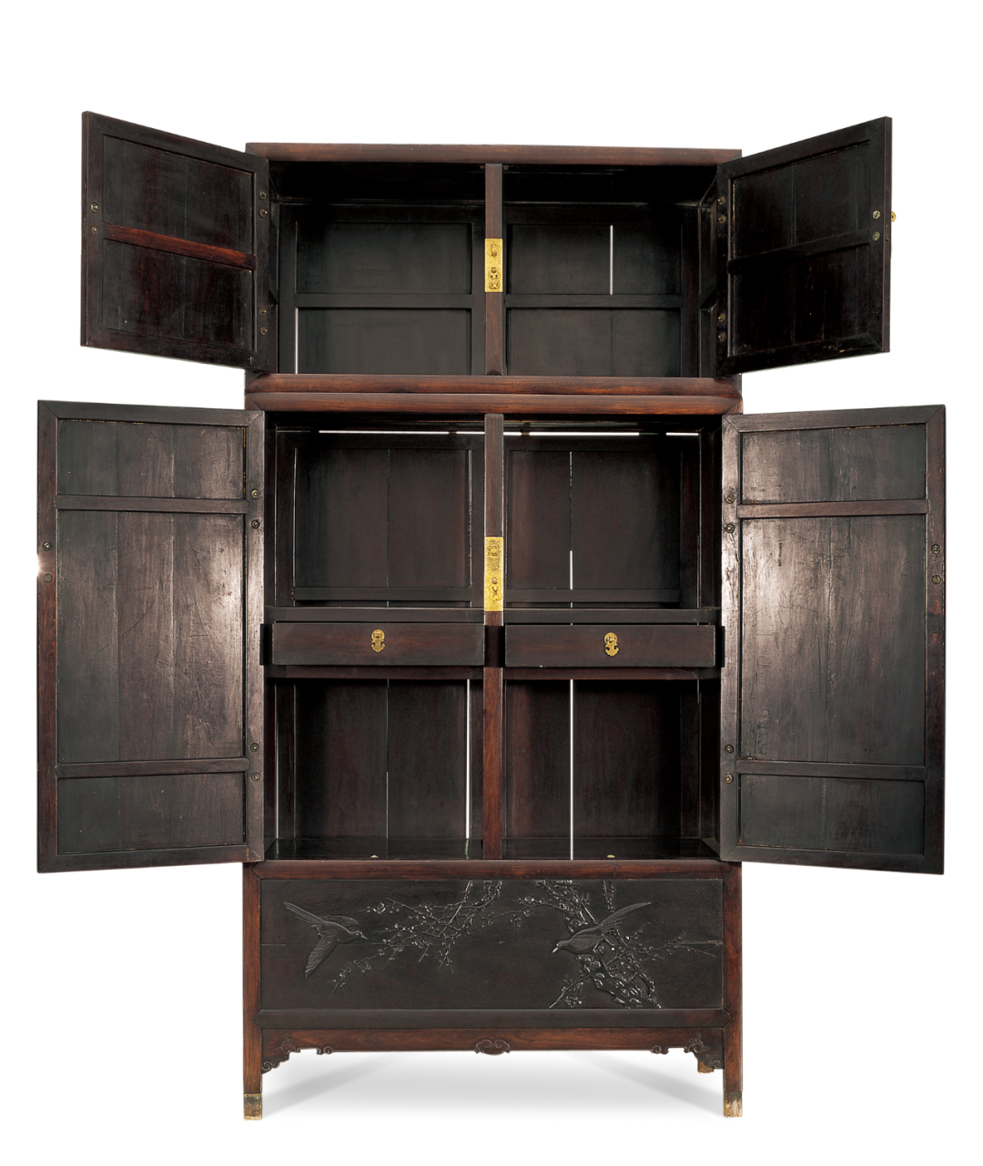 紫檀顶箱大柜夙为宫廷庙堂之器,或收存衣冠,或贮藏珍玩,为清代宫廷起居之必备。此对气势恢宏的清乾隆紫檀花鸟纹大柜为标准顶箱立柜式大方角四件柜,全部部件精选紫檀大料制成,是俗称“满彻”的紫檀家具。此对大柜着录于田家青先生《明清家具集珍》一书,为该书封面(2001年7月香港三联书店),是一件密藏多年、风华久闻于海内外的宫廷家具名品。