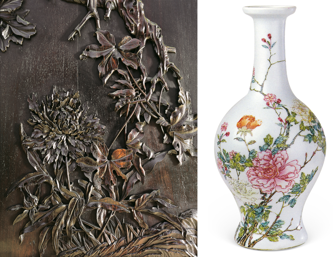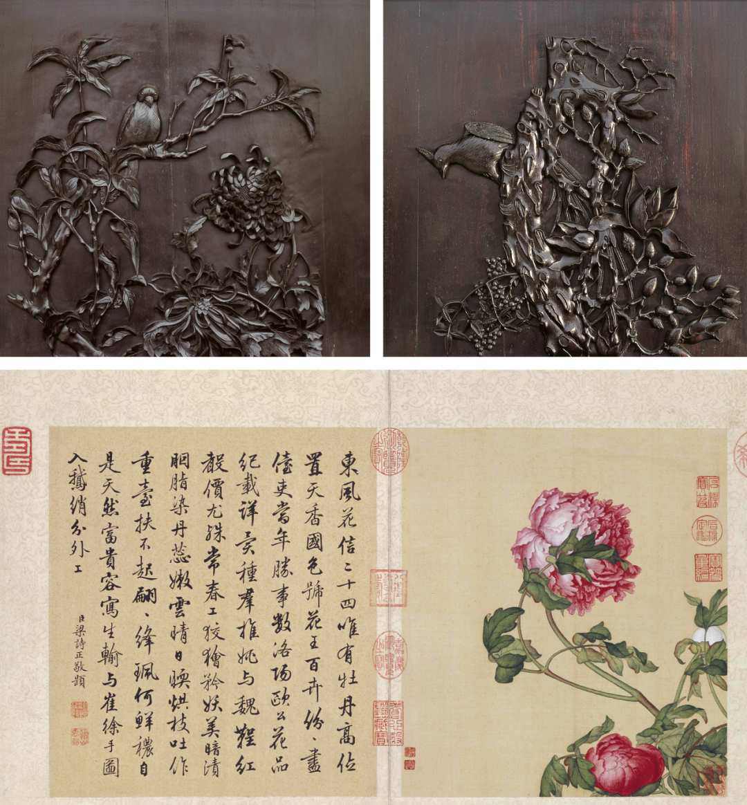 柜门各图案独立成章,又相互呼应,烘托整体效果,分别雕有荷花、浮萍、玉兰、天冬、灵芝、牡丹、芭蕉、水仙、芍药、藤萝、松、竹、梅,以及绶带、鹭鸶、芦雁、鸽子、喜鹊、画眉、仙鹤、锦鸡等图案,分别寓意“喜上眉梢”、“锦上添花”、“富贵荣华”、“一路连科”等。画面布局章法严谨,疏密得当,穿插自如,具有典型清代中期画风,与清宫珐琅彩瓷器所用画片如出一辙,当是出自清代宫廷画师之手。以“锦鸡牡丹”一扇中的牡丹为例,工匠在雕刻牡丹花瓣的表现上,极尽俯仰反侧之能事,凹凸层次之多令人叹服,与中国传统工笔花鸟的以线描取胜的风格大异其趣,而与受西洋影响的雍正珐琅彩雉鸡牡丹碗上同样着重表现牡丹之凹凸质感的技法相似。而柜顶柜门上的一扇“菊花画眉”图,对比郎世宁的花鸟册中的一页,构图和题材相同,在花瓣、枝叶的表现技法上风格完全一致,造型写实极富于立体感。可见此柜的画稿出自受郎世宁画风影响的宫廷画师之手,具有中西结合的圆明园宫廷艺术特点。